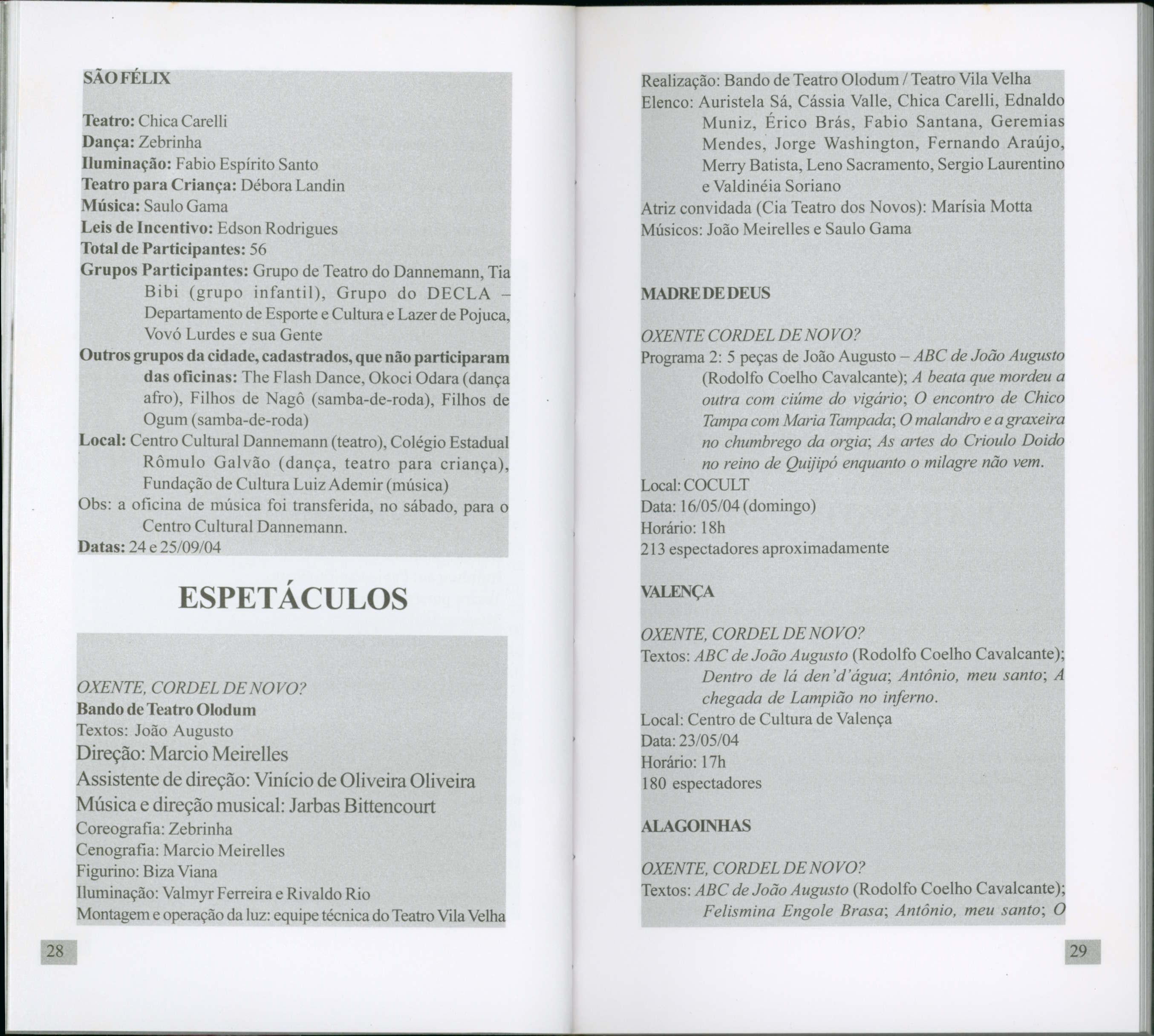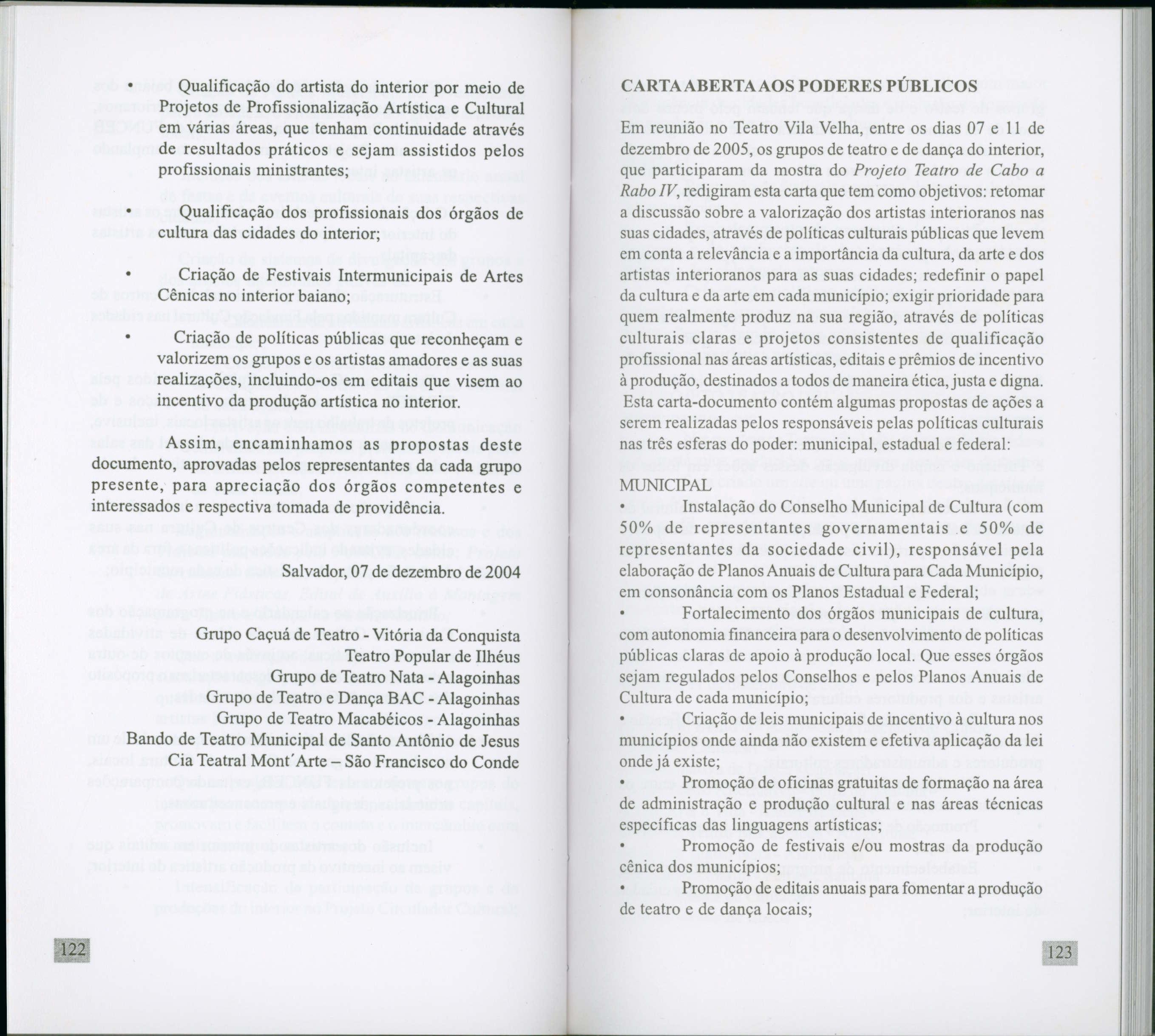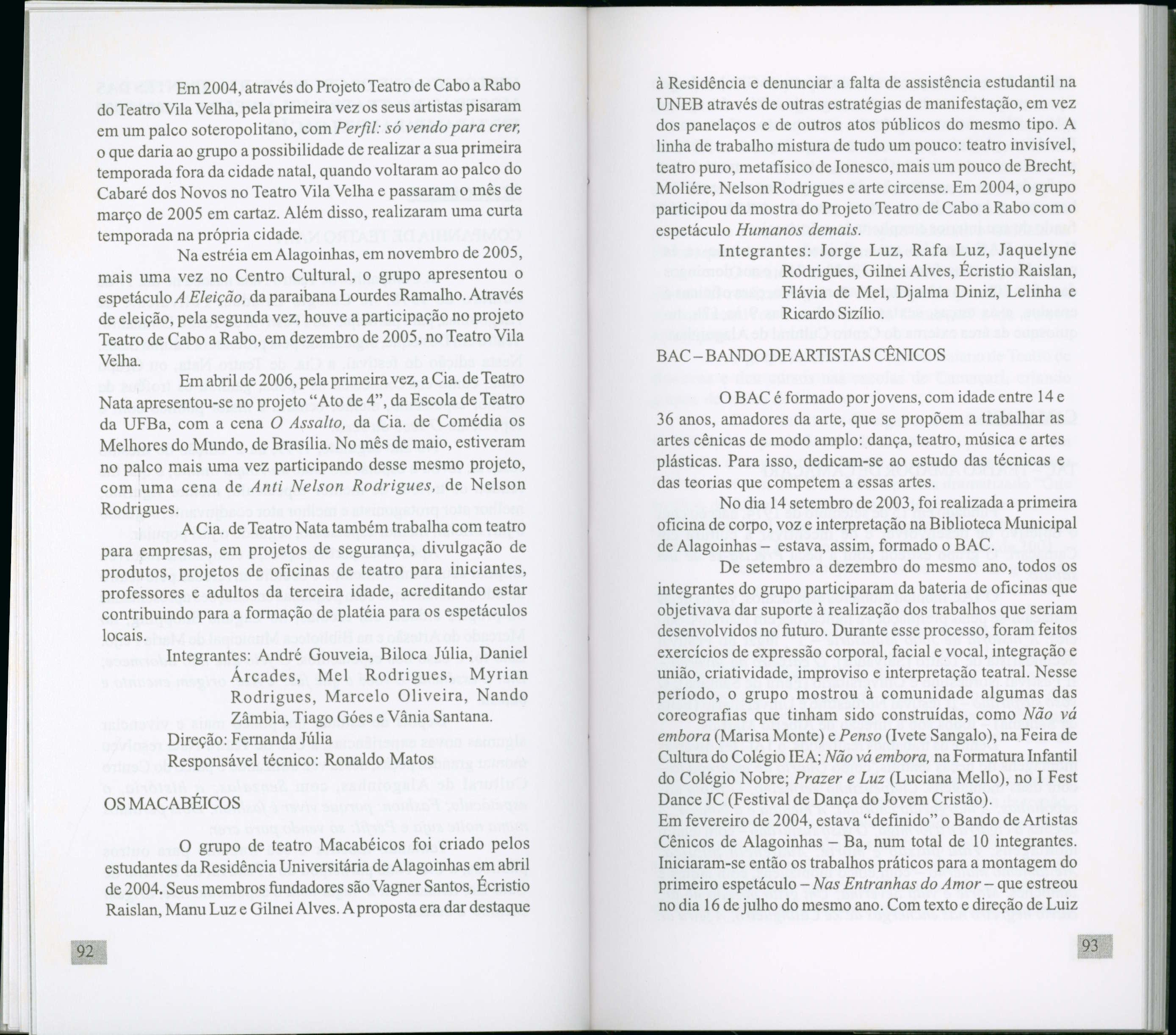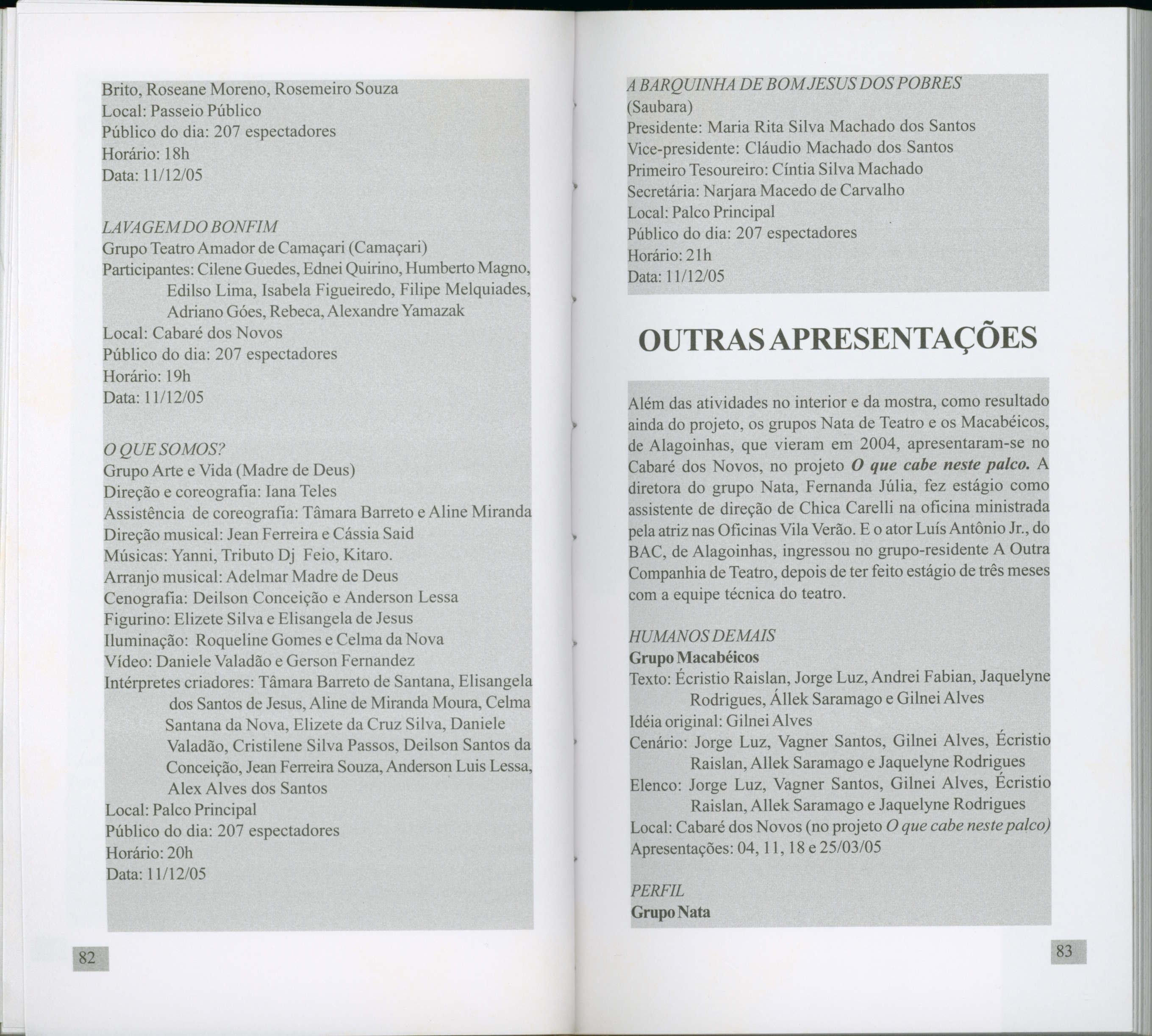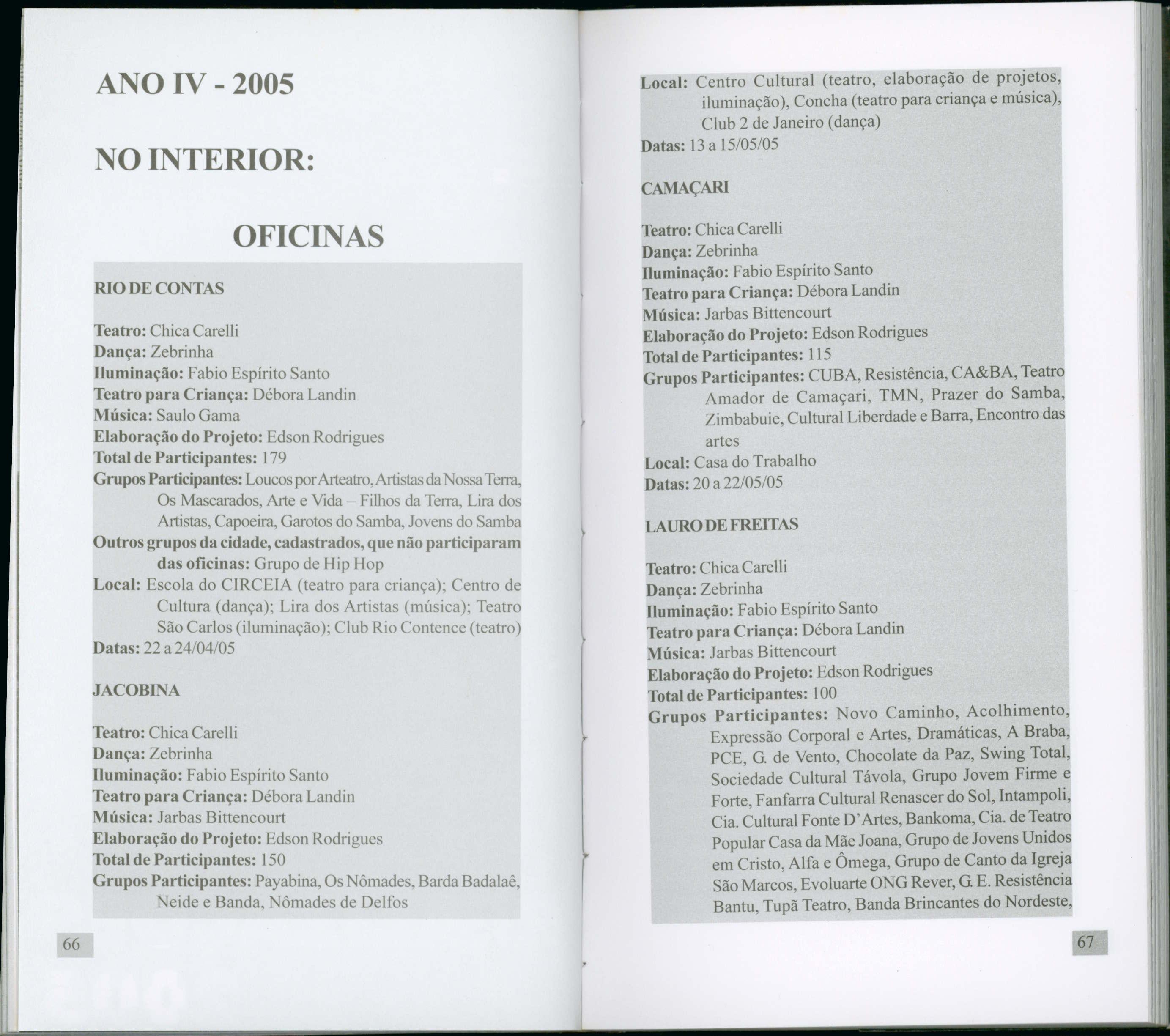 Em suas páginas estão ecos de grupos que marcaram e muitos continuam a marcar o território cultural da Bahia. Ano III [2004]: Grupo Cultural Forró Tradição Chinelão, Companhia de Teatro Nata, Grupo de Teatro Dannemann. Ano IV [2005]: Os Mascarados , Arte e Vida, Os Nômades, Teatro Amador de Camaçari, Sociedade Cultural Távola, entre tantos outros igualmente pulsantes.