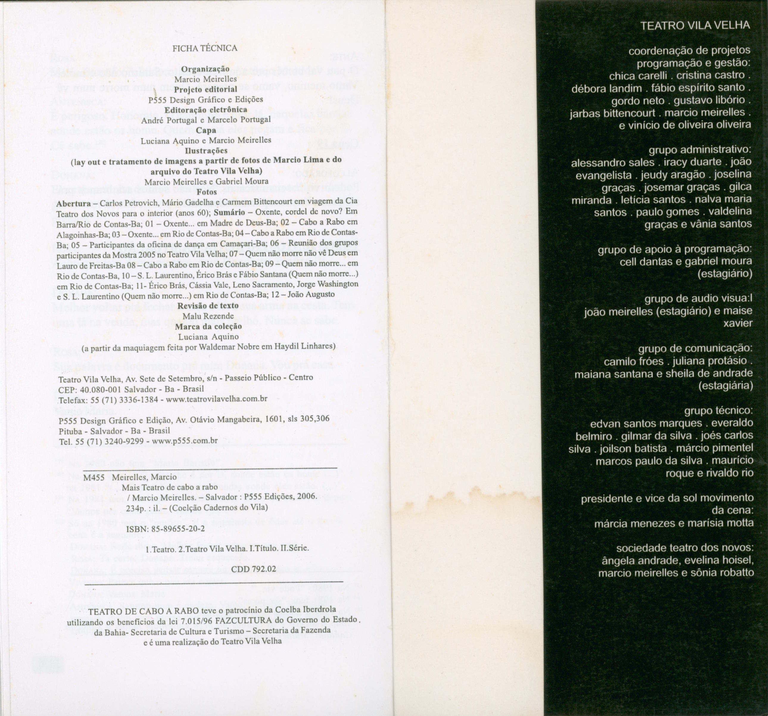 Relançar Mais Teatro de Cabo a Rabo [Ano III e Ano IV], é abrir novamente um livro que não termina: um livro feito de vozes, travessias, risos e silêncios. É voltar a um corpo em movimento, o corpo múltiplo do teatro baiano que, desde o interior, inventa mundos mais possíveis, de um teatro que nasce longe dos grandes centros, mas que pulsa com a mesma frequência e vitalidade, ou talvez com ainda mais urgência, nas cidades, distritos e povoados da Bahia. É reconhecer o vigor criativo do interior, onde a cena também se faz com o que se tem à mão: ruas, becos, escolas, estradas, praças, o corpo, a palavra, e acima de tudo, o desejo de estar junto em coletivo.
