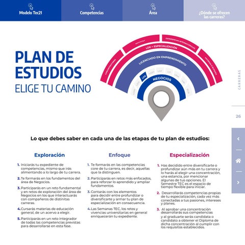 3. Participarás en un reto fundamental y en retos de exploración del área de Negocios en los que interactuarás con compañeros de distinitas carreras. 4. Cursarás materias de educación general, de un acervo a elegir. 5. Participarás en un reto integrador de todas las competencias previstas para desarrollarse en esta fase.