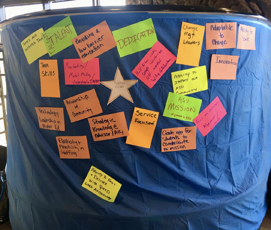 Culture is socially constructed through our underlying beliefs, values, principles, behaviors and enabling structures. It can be witnessed in our conversations and the outcomes of our collaborations. At ASU, our Enterprise Technology team takes an appreciative approach. We illuminate what is working, what we need to change and what we should let go. We co-create our vision of a thriving future and the steps we need to take to realize our dreams.