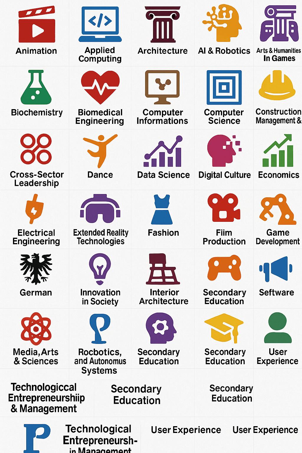 Game Engines, Graphics and Rendering, Audio, Physics, Cloud Computing and Multiplayer, Input handling, Animation, UI/UX, Game Logic, Scripting, Mechanics and Strategy