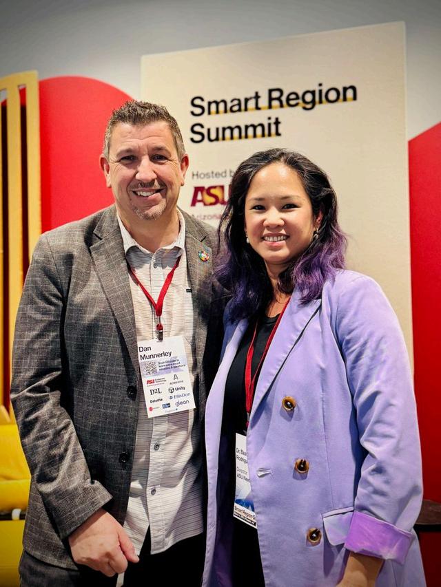 Dr. Bea Rodriguez-Fransen and Dan Munnerley were featured as speakers at ASU’s Smart Region Summit on March 4, 2025. Rodriguez-Fransen served on a panel on Indigenous Communities and Social Impact, exploring the use of digital twin technology among Indigenous communities and discussing issues around capacitybuilding, digital sovereignty, and ethical frameworks. Munnerley was a panelist for the Education and Workforce Development stream, delving into the use of digital twin technology and AI to enhance education and workforce development by creating immersive learning experiences, improving training outcomes, and better aligning educational programs with industry needs