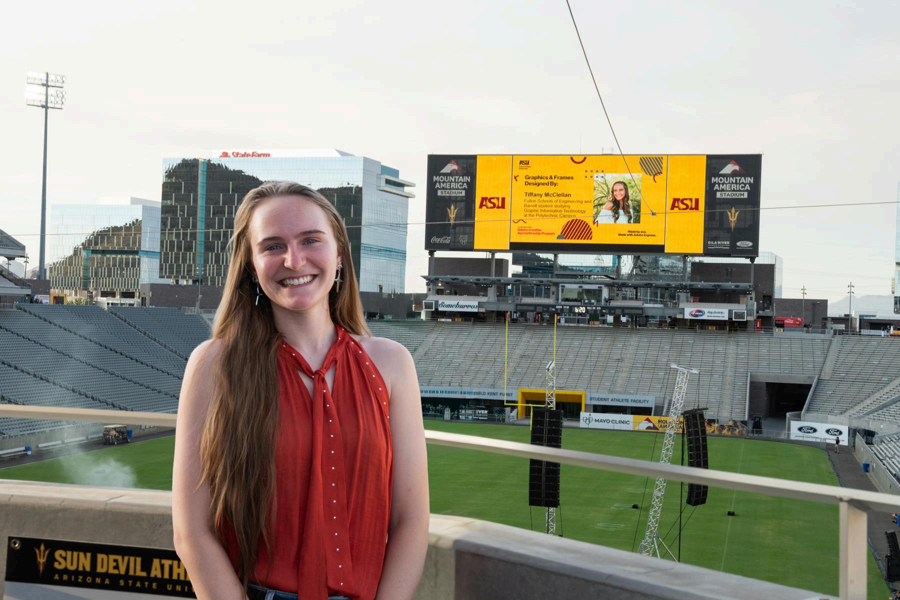 From dance cam to selfie cam, the jumbotron at ASU’s Welcome Night lit up the stage with first-time students this past August. But for ASU senior Tiffany McClellan, the graphic designs used on the big screen felt like a major accomplishment and culmination of her education journey at ASU so far.