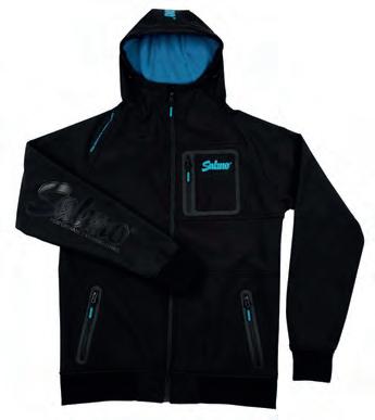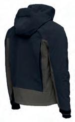 Fabricada en polyester y algodón, malla elástica trasera, bolsillos delanteros dobles, cierre central bidireccional. Color azul con negro y naranja