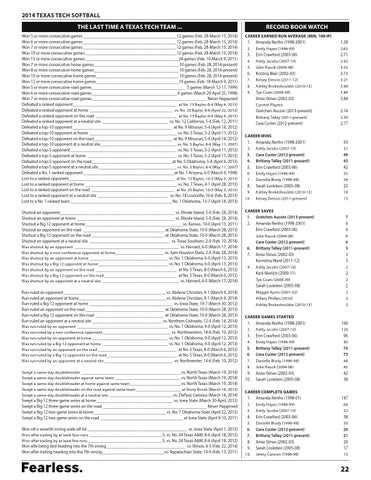 Run-ruled an opponent_________________________________________________ vs. Abilene Christian, 9-1 (March 9, 2014) Run-ruled an opponent at home__________________________________________ vs. Abilene Christian, 9-1 (March 9, 2014) Run-ruled a Big 12 opponent at home________________________________________ vs. Iowa State, 19-7 (March 30, 2012) Run-ruled an opponent on the road______________________________________ at Oklahoma State, 10-0 (March 28, 2013) Run-ruled a Big 12 opponent on the road_________________________________ at Oklahoma State, 10-0 (March 28, 2013) Run-ruled an opponent at a neutral site__________________________________ vs. Northern Colorado, 12-4 (Feb. 14, 2014) Was run-ruled by an opponent____________________________________________ vs. No. 1 Oklahoma, 9-0 (April 12, 2013) Was run-ruled by a non-conference opponent_________________________________ vs. Northwestern, 14-6 (Feb. 10, 2012) Was run-ruled by an opponent at home_____________________________________ vs. No. 1 Oklahoma, 9-0 (April 12, 2013) Was run-ruled by a Big 12 opponent at home________________________________ vs. No. 1 Oklahoma, 9-0 (April 12, 2013) Was run-ruled by an opponent on the road______________________________________ at No. 5 Texas, 8-0 (March 6, 2012) Was run-ruled by a Big 12 opponent on the road__________________________________ at No. 5 Texas, 8-0 (March 6, 2012) Was run-ruled by an opponent at a neutral site_________________________________ vs. Northwester, 14-6 (Feb. 10, 2012) Swept a same-day doubleheader________________________________________________vs. North Texas (March 19, 2014) Swept a same-day doubleheader against same team________________________________vs. North Texas (March 19, 2014) Swept a same-day doubleheader at home against same team_________________________vs. North Texas (March 19, 2014) Swept a same-day doubleheader on the road against same team______________________ at Stony Brook (March 14, 2012) Swept a same-day doubleheader at a neutral site_______________________________ vs. DePaul, Canisius (March 14, 2014) Swept a Big 12 three-game series at home_____________________________________ vs. Iowa State (March 30-April, 2012) Swept a Big 12 three-game series on the road__________________________________________________ Never Happened Swept a Big 12 two-game series at home___________________________________ vs. No. 7 Oklahoma State (April 22, 2012) Swept a Big 12 two-game series on the road________________________________________ at Iowa State (April 9-10, 2011) Won off a seventh inning walk-off hit________________________________________________ vs. Iowa State (April 1, 2012) Won after trailing by at least four runs___________________________________ 5, vs. No. 24 Texas A&M, 8-6 (April 18, 2012) Won after trailing by at least five runs____________________________________ 5, vs. No. 24 Texas A&M, 8-6 (April 18, 2012) Won afte being tied heading into the 7th inning______________________________________ vs. Illinois, 4-3 (Feb. 22, 2014) Won after trailing heading into the 7th inning______________________________vs. Appalachian State, 10-9 (Feb. 13, 2011)