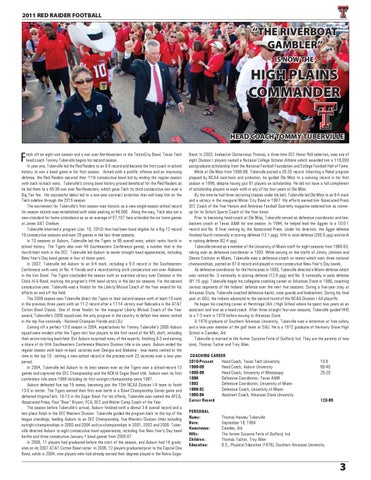 Bowl. In 2003, linebacker Dontarrious Thomas, a three-time SEC Honor Roll selection, was one of eight Division I players named a National College Scholar-Athlete which awarded him a $18,000 postgraduate scholarship from the National Football Foundation and College Football Hall of Fame. While at Ole Miss from 1995-98, Tuberville posted a 25-20 record. Inheriting a Rebel program plagued by NCAA sanctions and probation, he guided Ole Miss to a winning record in his first season in 1995, despite having just 61 players on scholarship. He did not have a full compliment of scholarship players to work with in any of his four years at Ole Miss. By the time he had three recruiting classes under his belt, Tuberville led Ole Miss to an 8-4 mark and a victory in the inaugural Motor City Bowl in 1997. His efforts earned him Associated Press SEC Coach of the Year Honors and American Football Quarterly magazine selected him as runnerup for its Schutt Sports Coach of the Year honor. Prior to becoming head coach at Ole Miss, Tuberville served as defensive coordinator and linebackers coach at Texas A&M for one season. In 1994, he helped lead the Aggies to a 10-0-1 record and No. 8 final ranking by the Associated Press. Under his direction, the Aggie defense finished fourth nationally in scoring defense (13.1 ppg), fifth in total defense (265.5 ypg) and sixth in rushing defense (92.4 ypg). Tuberville served as a member of the University of Miami staff for eight seasons from 1986-93, taking over as defensive coordinator in 1993. While serving on the staffs of Jimmy Johnson and Dennis Erickson at Miami, Tuberville was a defensive coach on teams which won three national championships, posted an 87-9 record and played in nine consecutive New Year’s Day bowls. As defensive coordinator for the Hurricanes in 1993, Tuberville directed a Miami defense which was ranked No. 3 nationally in scoring defense (12.6 ppg) and No. 5 nationally in pass defense (91.15 ypg). Tuberville began his collegiate coaching career at Arkansas State in 1980, coaching various segments of the Indians’ defense over the next five seasons. During a five-year stay at Arkansas State, Tuberville coached defensive backs, nose guards and linebackers. During his final year at ASU, the Indians advanced to the second round of the NCAA Division I-AA playoffs. He began his coaching career at Hermitage (Ark.) High School where he spent two years as an assistant and two as a head coach. After three straight four-win seasons, Tuberville guided HHS to a 7-3 mark in 1979 before moving to Arkansas State. A 1976 graduate of Southern Arkansas University, Tuberville was a letterman at free safety and a two-year member of the golf team at SAU. He is a 1972 graduate of Harmony Grove High School in Camden, Ark. Tuberville is married to the former Suzanne Fette of Guilford, Ind. They are the parents of two sons, Thomas Tucker and Troy Allen. COACHING CAREER 2010-Present Head Coach, Texas Tech University 1999-08 Head Coach, Auburn University 1995-98 Head Coach, University of Mississippi 1994 Defensive Coordinator, Texas A&M 1993 Defensive Coordinator, University of Miami 1986-92 Defensive Coach, University of Miami 1980-84 Assistant Coach, Arkansas State University Career Record PERSONAL Name: Born: Hometown: Wife: Children: Education: