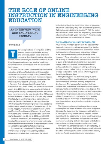 he widespread use of computers and the internet have made distance learning and online education easier and more accessible. Enrollment in online education courses increased rapidly all over the world since 2000. Even though growth rates are slowing, enrollment for online courses still increases with the advance in technology. So what are the current state of and trends in online education and how effective is the online education with the continuous technology advancement? There are many surveys and studies that monitor and assess the status and effectiveness of online education. The Babson Survey Research Group (I.E. Allen and J. Seaman, Online Report Card–Tracking Online Education in the United States) has produced an annual report since 2002. Among many results of the latest survey report, faculty’s perceptions of online education have not improved in the past decade. Only 29.1 percent of chief academic officers said in 2015 that they believe their faculty view online learning as legitimate and valuable. On the other hand, studies also show that effectiveness of online learning varies across academic subject areas, as well as types of students. (e.g., D. Xu and S. Jaggars, “Performance Gaps Between Online and Face-to-Face Courses: Differences Across Types of Students and Academic Subject Areas” Journal of Higher Education, vol. 85, no. 5., 2014, pp. 633-659). Based on these results, it is interesting to see how faculty of the engineering school at an urban university view the role of online instruction in engineering education, as well as their perceptions of student learning. For this article I interviewed 20 faculty members in the College of Engineering at Wayne State University and asked their opinions on the role of 22 | TechCentury | WINTER 2016