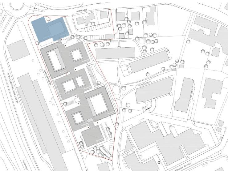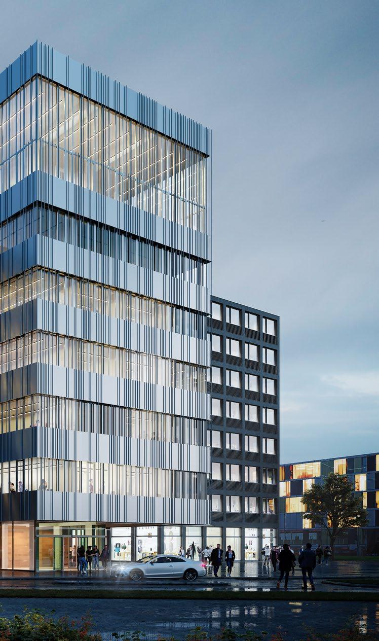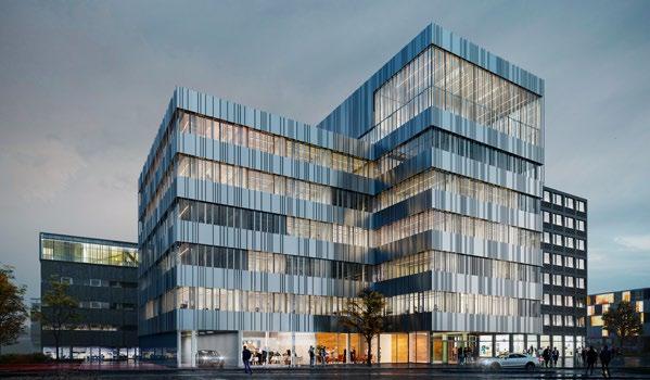 der Kreislaufwirtschaft bei den verwendeten Baumaterialien ein hoher Grad an Recycling-Materialien angestrebt. Eine PV-Anlage, eine energieeffiziente Fassade sowie ein für alle Mieter:innen zugänglicher Dachgarten und extensiv begrünte Flachdächer sind Beispiele für das nachhaltige Konzept.