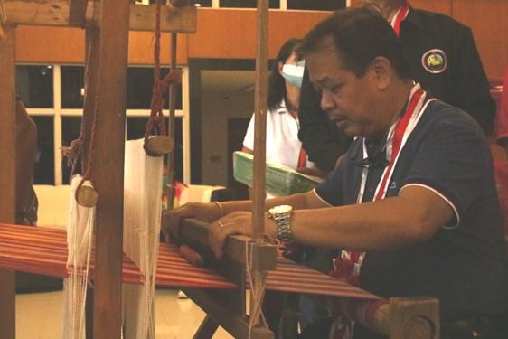 WEAVING CULTURE. Dr. Mario R. Briones, University President, as he tries to use the loom to combine warp and weft.