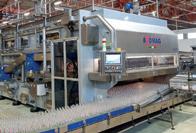 The bottle washer has been specially designed to minimise the environmental impact, with particular attention to water and steam consumptions, and to the duration of the detergent bath. The completely automated wash cycle includes an initial bottle-emptying station followed by a prewash spraying and first pre-soak bath that significantly reduces detergent bath pollution and markedly decreases consumption levels. In the pre-soak area the project also provides for the installation of a belt filter that allows to automatically remove the main impurities typical of recycled bottles (straws, paper, cigarette butts, for instance). The washing of bottles is completed with the internal and external high-pressure detergent wash sprays, using self-cleaning and self-centring rotating nozzles.