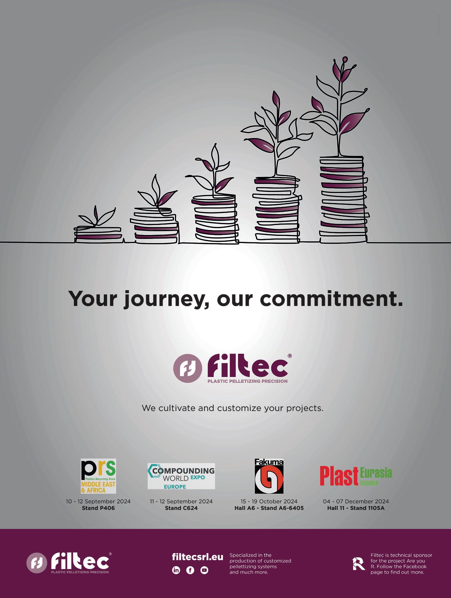 & Africa scheduled in Dubai with a stand located at position P406. On 11 and 12 September, the company will participate in the Compounding World Expo Europe in Brussels, at stand C624. From 15 to 19 October, a company delegation will travel to Germany for the 2024 edition of Fakuma, a landmark event global for the processing of plastic materials. It will be possible to meet Filtec at stand A6-6405 in pavilion A6. From 4 to 7 December the company will close the year on a high note with Plast Eurasia scheduled in Istanbul, where it will exhibit at stand 1105AHall11.