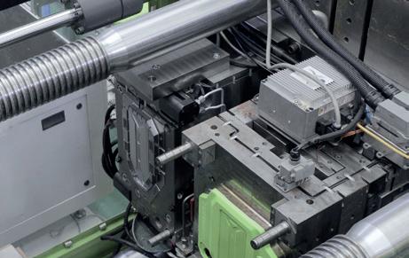 • A turnkey system centred around a vertical Allrounder 375 V demonstrates how vacuum housings can be produced with space-saving firmly in mind. A Kuka six-axis robot is mounted within the footprint. The Arburg Turnkey Control Module (ATCM) is used to help seamlessly track material and process data.