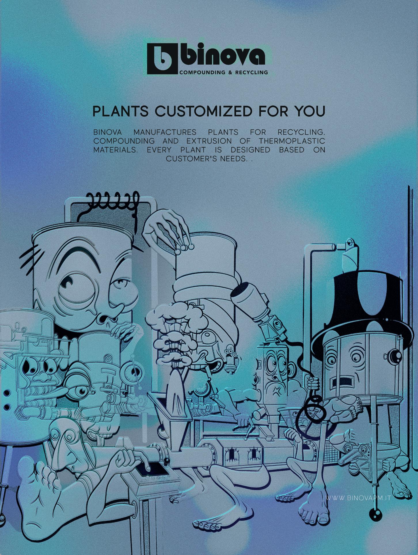 line very competitive; Binova offers its customers something unique, with reduced material handling within the production plant, and proven reduced energy consumption compared to plants on the market today: for LDPE-based polyolefin materials, consumption will be no more than 0.26/0.27 kW/kg while for polypropylene or polystyrene-based materials, such as PP, PS or HIPS, consumption is guaranteed to be around 0.22/0.23 kW/kg (excluding process water cooling).