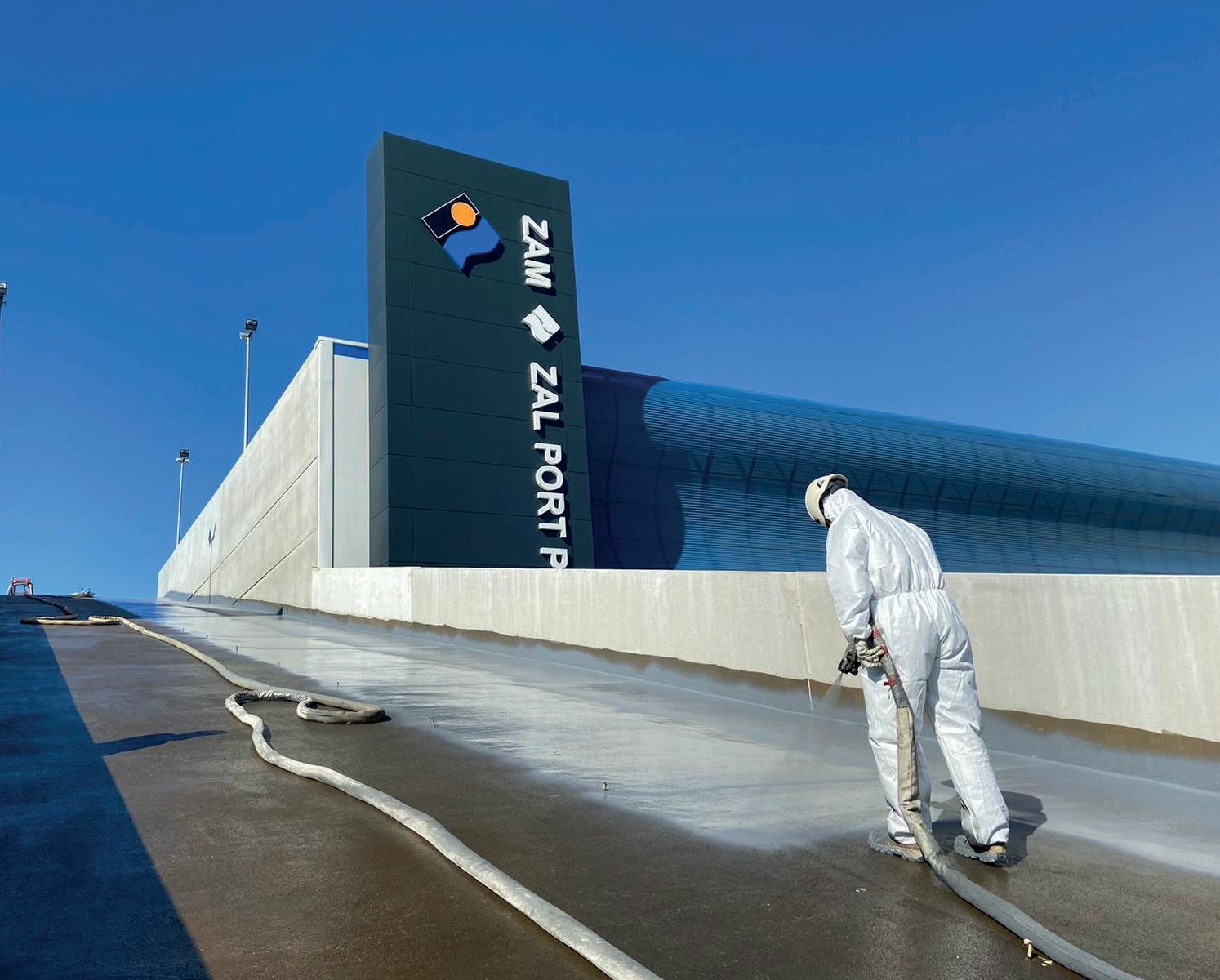 The membrane is applied using spray equipment that takes the two components and it will form the final solid membrane (isocyanates and amines).