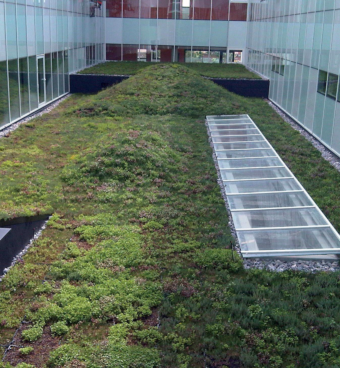 El sistema de impermeabilización para cubiertas ajardinadas protege al edificio absorbiendo el agua de lalluvia, proporcionando una impermeabilización eficaz a todo el conjunto de elementos que se vayan a proyectar, creando un hábitat para la vida silvestre y disminuyendo el estrés de las personas, proporcionando un paisaje más estético y agradable, y en definitiva, ayudando a reducir la temperatura del aire urbano a la vez que se mitiga el efecto invernadero.