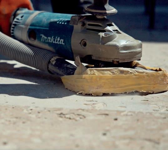 Se está realizando el lijado y arenado de las superficies de hormigón y barras metálicas, eliminando contaminantes y creando una superficie rugosa para mejorar la adherencia del sistema.