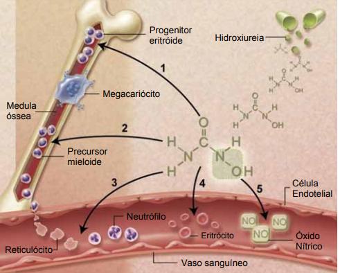 (1) INDUÇÃO DA HB FETAL POR MEIO DA ATIVAÇÃO DA GUANILATO CICLASE ALTERANDO A CINÉTICA DOS PRECURSORES ERITRÓIDES; (2) BAIXOS VALORES DE NEUTRÓFILOS E RETICULÓCITOS POR INIBIÇÃO DA RIBONUCLEOTÍDEO REDUTASE E CITOXICIDADE DA MEDULA; (3) DIMINUIÇÃO DA ADESIVIDADE E MELHORA DA REOLOGIA DOS NEUTRÓFILOS E RETICULÓCITOS CIRCULANTES; (4) REDUÇÃO DA HEMÓLISE PELA MELHOR HIDRATAÇÃO DOS ERITRÓCITOS, MACROCITOSE, E REDUÇÃO DA FALCIZAÇÃO; (5) O ÓXIDO NÍTRICO (NO) É LIBERADO E COMO POTENTE VASODILATADOR LOCAL, MELHORA A RESPOSTA VASCULAR