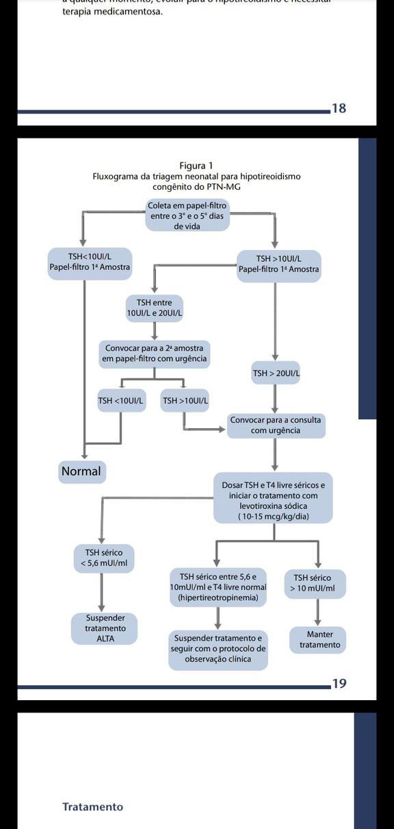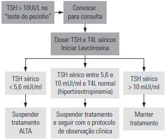A constatação de um TSH acima de 10µUI/mL, com T4 livre normal ou diminuído, confirma o diagnóstico da doença Bebês com TSH menor que 5,6µUI/ mL têm o diagnóstico de HC descartado , e são orientadas a suspender o tratamento e recebem alta do programa Já aquelas com elevação discreta do TSH (entre 5,6 e 10 µUI/mL) e T4 livre normal, são orientadas a suspender o tratamento, mas permanecem em acompanhamento clínicolaboratorial rigoroso, sem tratamento medicamentoso (Figura 6).