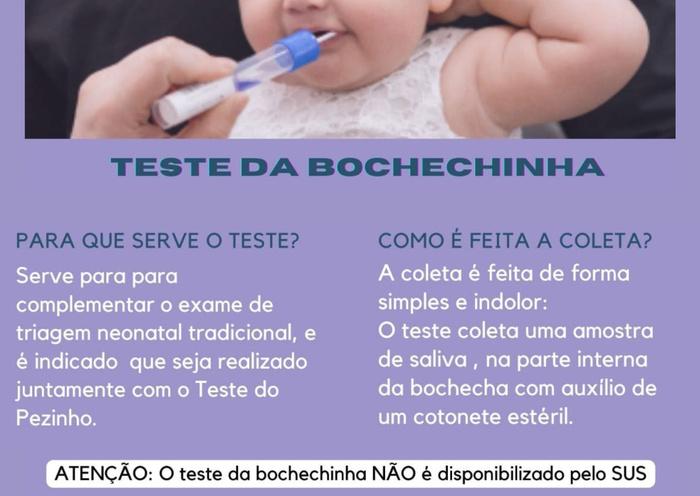 Há um exame de triagem neonatal feito para ajudar a identificar a ocorrência de HC, o Teste da Bochechinha É um exame de triagem neonatal genético, capaz de identificar mais de 340 doenças genéticas tratáveis que se manifestam na infância Além de complementar o tradicional teste do pezinho