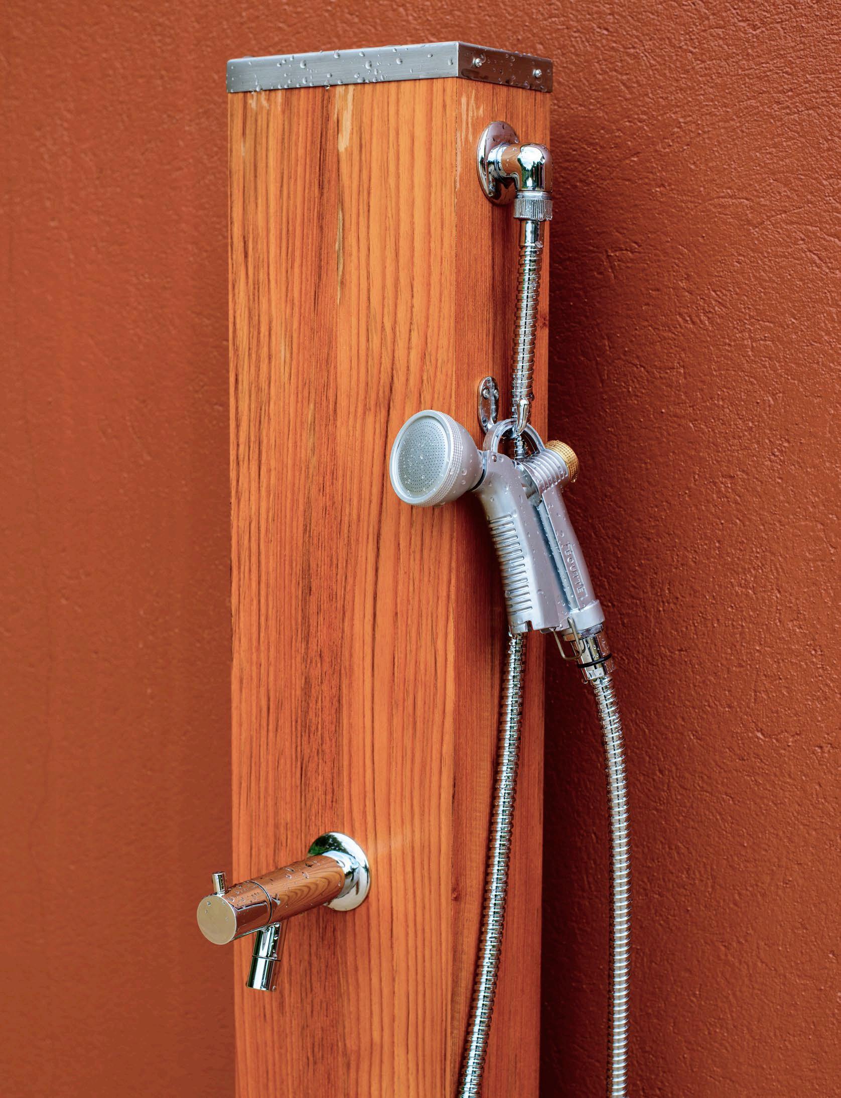 D’une hauteur d’un mètre, la borne California offre une belle structure en teck équipée d’un robinet rince-pieds et d’une douchette à main. Ses proportions sont idéales pour les petits espaces dans lesquels la couleur du teck se fond naturellement.