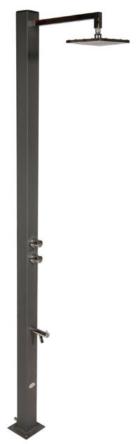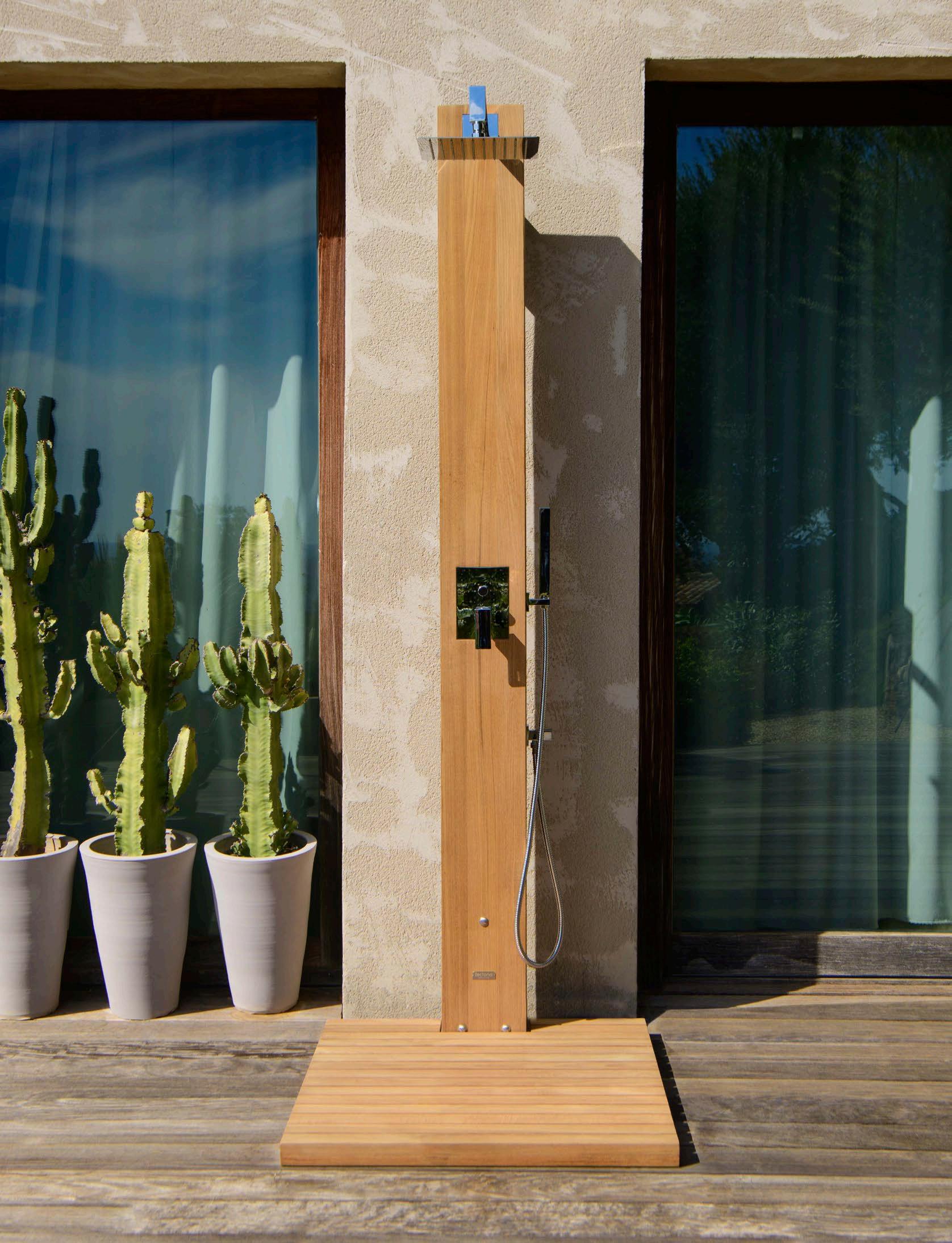 Ici, la douche de tête, orientable, distribue une eau à la température souhaitée grâce à un mitigeur intégré. Elle répond ainsi au désir de chacun de prendre une douche fraîche, tiède ou chaude. La colonne de Squadra ainsi que la pomme de douche carrée indiquent un parti pris moderniste qui privilégie l’angle droit.Réalisée en inox brossé qui tempère l’éclat du métal, elle est équipée d’un rince-pieds à eau froide. Pour un surplus de confort, un caillebotis en teck est disponible en option.