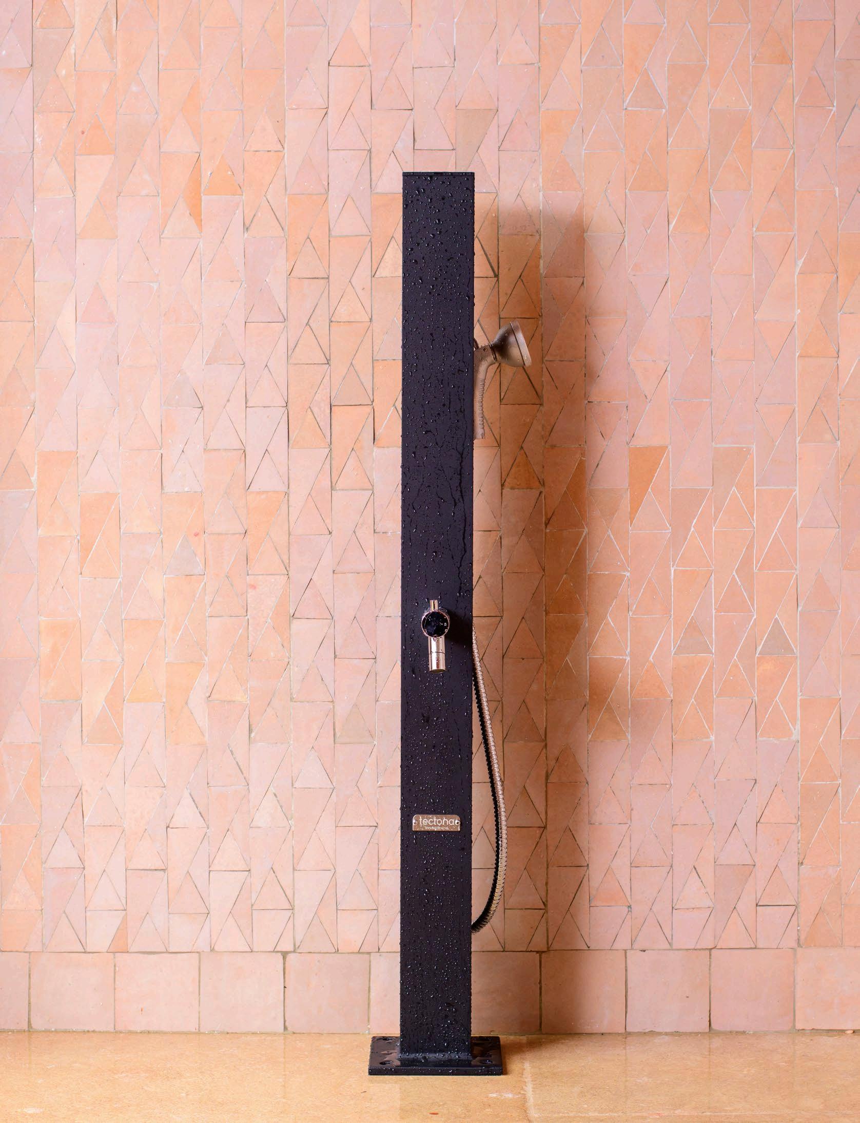 Éclipse solaire associe les vertus de l’énergie solaire aux qualités de noblesse et de résistance du teck. La pureté de son graphisme tient à sa solide structure à large section rectangulaire qui met en valeur la seule beauté naturelle du teck. La douche est équipée à l’arrière d’un réservoir en inox thermolaqué noir mat qui absorbe la chaleur du rayonnement solaire et offre une capacité de 17 litres d’eau chaude assurant 42 litres d’eau mitigée. Pour une efficacité maximale, il est nécessaire d’orienter la douche, le dos côté Sud.