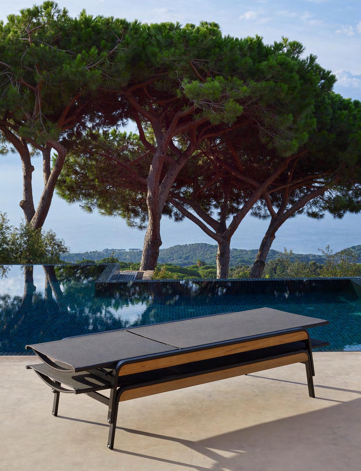 résistant à la corrosion, idéal pour l’extérieur, associé à une barre transversale en teck. Cette traverse latérale en teck massif souligne l'horizontalité du profil de la chaise longue. L'association des deux matériaux permet un contraste intéressant, car le teck — en plus de faire le lien avec le savoir-faire historique de Tectona — ajoute une finition naturelle et chaleureuse, et apporte de la clarté à l'ensemble. Ce détail, qui n’en est pas un, apporte beaucoup de cachet.