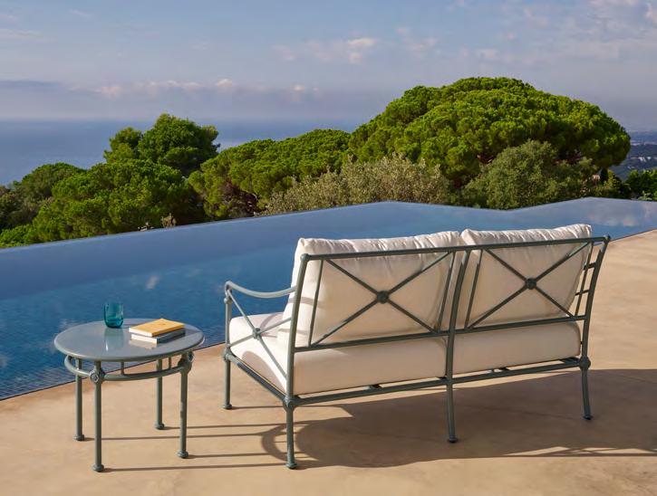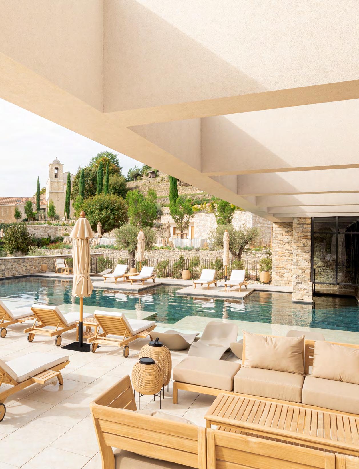 Conçu pour se fondre au paysage, le spa s’étend sur 2 500 m 2 selon une zone sèche consacrée aux soins et une zone humide multisensorielle. Tectona a investi le bord des piscines avec les accueillantes chaises longues en teck des collections Camarat et Southampton, l’indispensable chilienne Copacabana ou encore l’invitation à la détente des canapés modulables Exeter. Les tables basses en teck, carrées et rectangulaires Duxford rythment cet espace dévolu à la détente. Quant aux parasols Roma, ils offrent ombre et fraîcheur pour tempérer les ardeurs du soleil, grand maître de cette escapade au pays des cigales.