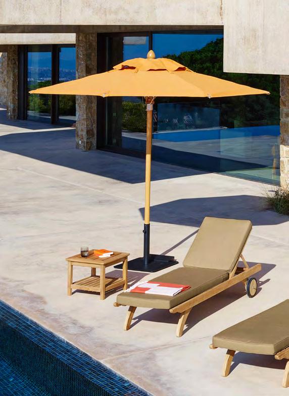 Sa structure en aluminium et sa corolle en toile textilène assurent une très grande résistance à Florida. Inclinable, il permet de se protéger du soleil, sans changer de place et quelle que soit l’heure. Florida se déplace sans effort, il s’ouvre et se referme facilement et il est muni d’un système de ventilation en haut du mât afin d’éviter toute prise au vent. Ici, il abrite la chaise longue empilable, Horizon, conçue par les designers AC/AL.
