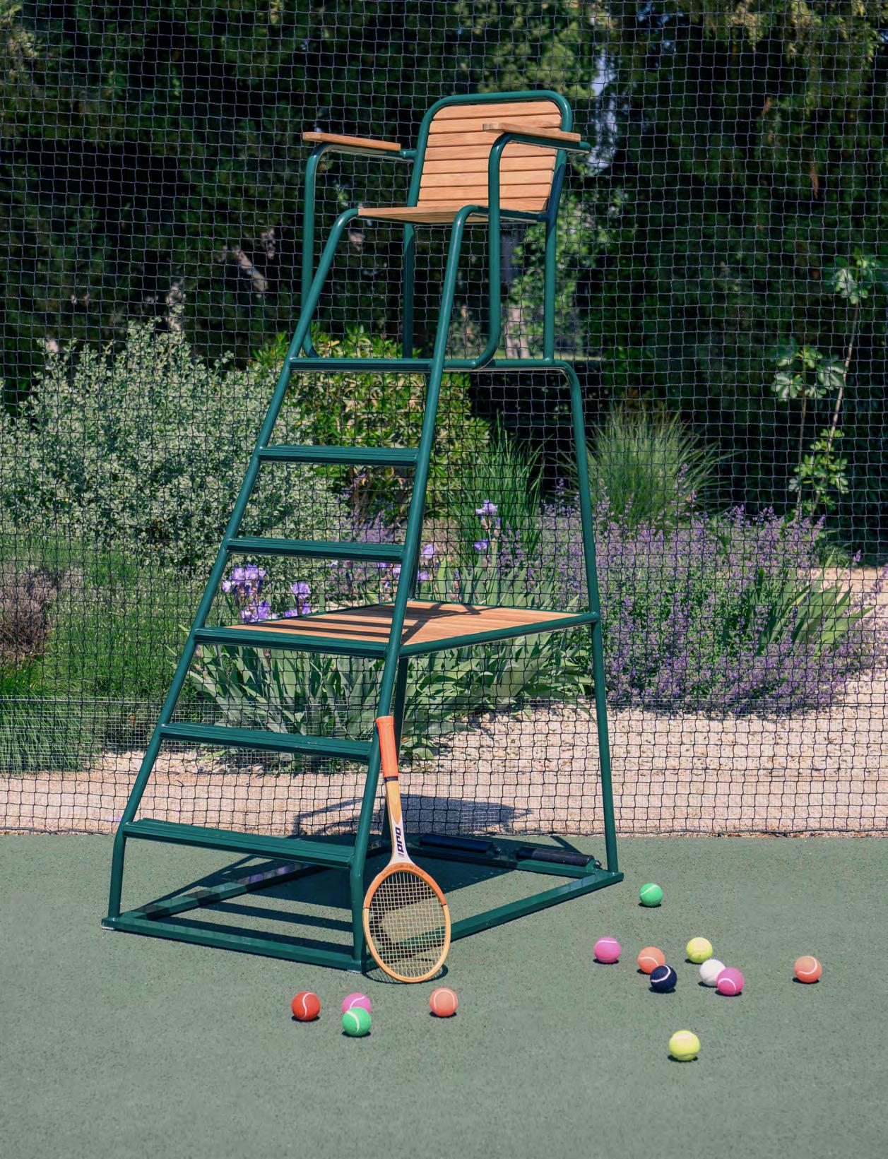 Ne pas tout réinventer, mais au contraire sublimer les qualités d’un objet qui fit ses preuves durant près d’un siècle. Voilà l’un des points de départ de cette réflexion menée pour « renouveler la chaise d’arbitre », mission confiée, à l’époque, à Tectona par un amateur de design, Jean-Claude Blanc, alors directeur général de la Fédération française de tennis et responsable de l’organisation du tournoi de Roland-Garros. « Mon dessin ne vient pas de nulle part, raconte Pierre Charpin, il reprend, avec davantage de sobriété, la volumétrie originelle de ce modèle populaire et archétypal datant des années 1920. L’angle d’inclinaison des marches, par exemple, est conçu afin que l’arbitre, en cas de litige, puisse descendre rapidement de son siège sans quitter des yeux la trace de la balle sur le court, puis y remonter avec la même célérité». Arborant une structure élégante mariant lattes en teck et tube en aluminium thermolaqué, cette nouvelle chaise d’arbitre était, à l’époque, destinée à équiper les principaux courts du stade Roland-Garros, tels le Philippe-Chatrier et le Suzanne-Lenglen, or le départ du directeur général a mis fin à l’aventure. Il n’empêche : débarrassée de ses accessoires « officiels » — micro, ordinateur pour le comptage des points, emplacements publicitaires —, l’assise a néanmoins intégré le catalogue Tectona, en 2007. Bibliophile compulsif, feu le couturier Karl Lagerfeld, pour ne pas le nommer, l’avait, lui, « détournée » pour en faire un… escabeau de bibliothèque.