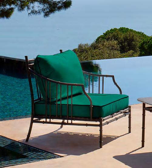 Le design de ce fauteuil est inspiré par la structure et les nodosités des cannes de bambous. Réalisé en aluminium, il offre une assise et un dossier aux généreuses dimensions, garnis de profonds coussins extrêmement confortables. Nous vous proposons deux coloris pour ces coussins, soit blanc, soit vert, tous deux subtilement soulignés par un passepoil noir.