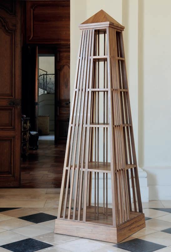 Imaginée par Alexis de La Falaise (1948-2004), cette bibliothèque d’intérieur, montée sur roues et tournante, est réalisée en teck verni et satiné. Sa forme en obélisque ajourée se prête à un accès rapide aux ouvrages, quelle que soit leur taille, répartis de la base au sommet, allant des grands livres d’art jusqu’aux petits romans fétiches.