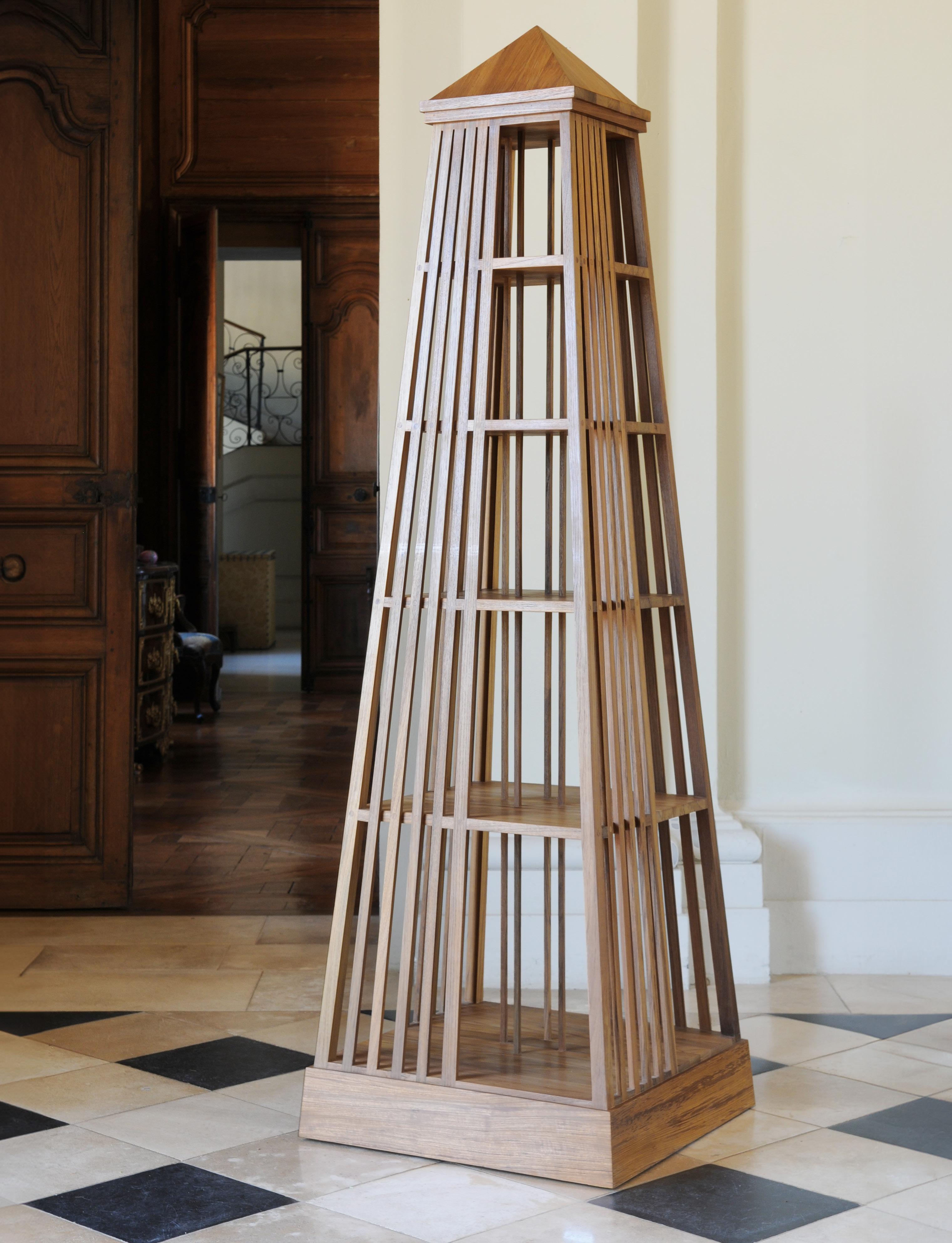 Biblioteca de interior, en madera de teca barnizada y satinada, montada sobre ruedas y con una estructura giratoria, Biblos le invita a una travesía hacia la antigüedad egipcia a través de su forma en obelisco, homenajeando a la célebre biblioteca de Alejandría. Concebida para los amantes de los libros, permite un rápido acceso a las obras, sin importar su tamaño, repartidos desde la base hasta la cima, abarcando desde grandes libros de arte hasta las mejores novelas cortas.
