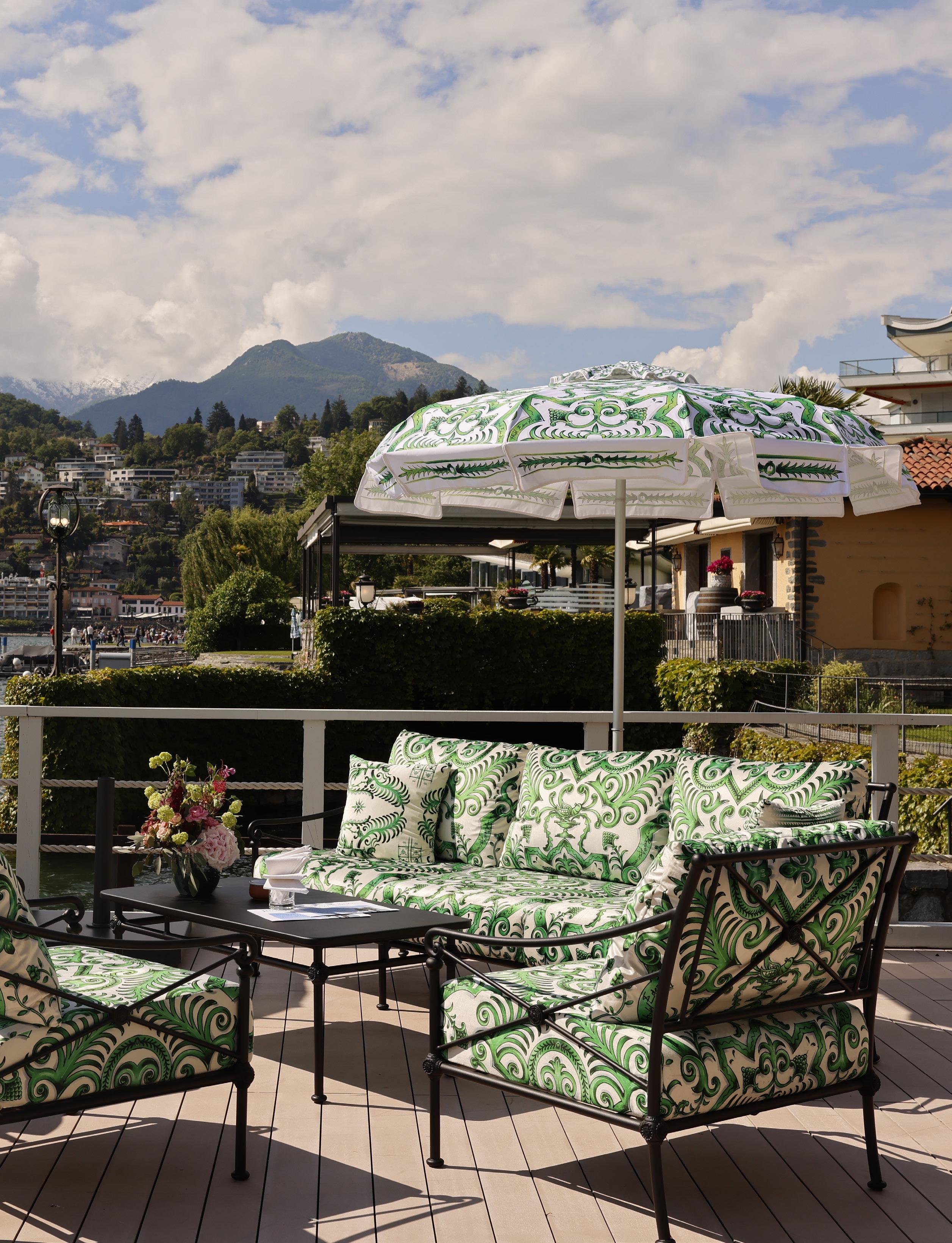 La colección 1800 se integra en los jardines del hotel 5 estrellas Eden Roc anidado a las orillas luminosas del lago Mayor. Y se viste de una tela inspirada en las cerámicas locales de San Rocco de Ascona para la ocasión.