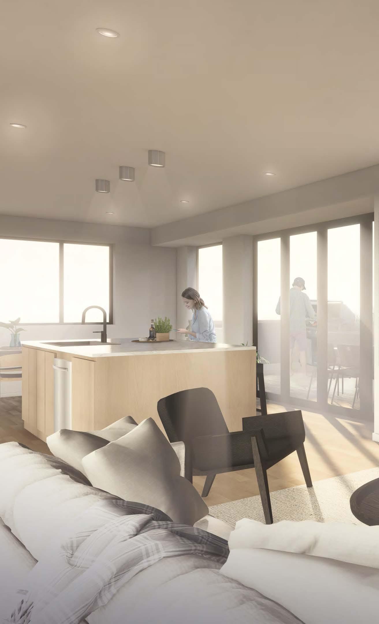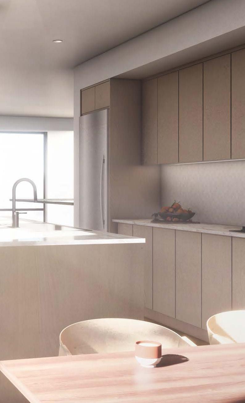 aesthetic. Enjoy spacious residences with nine-foot ceilings, chef’s kitchens, and custom-designed cabinetry. The luxurious bathrooms feature high-end designer wall tiles, custom cabinets, and stone counters.