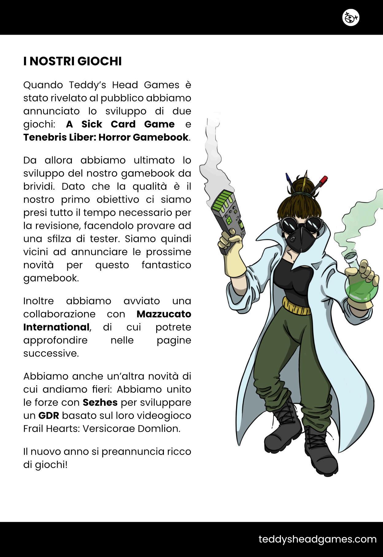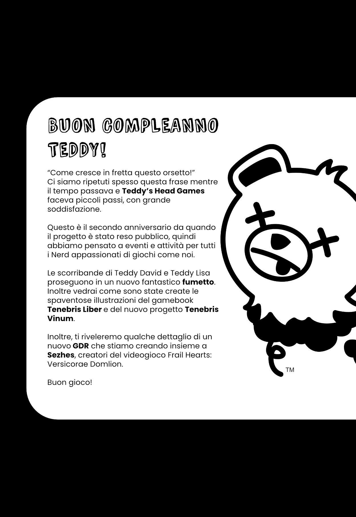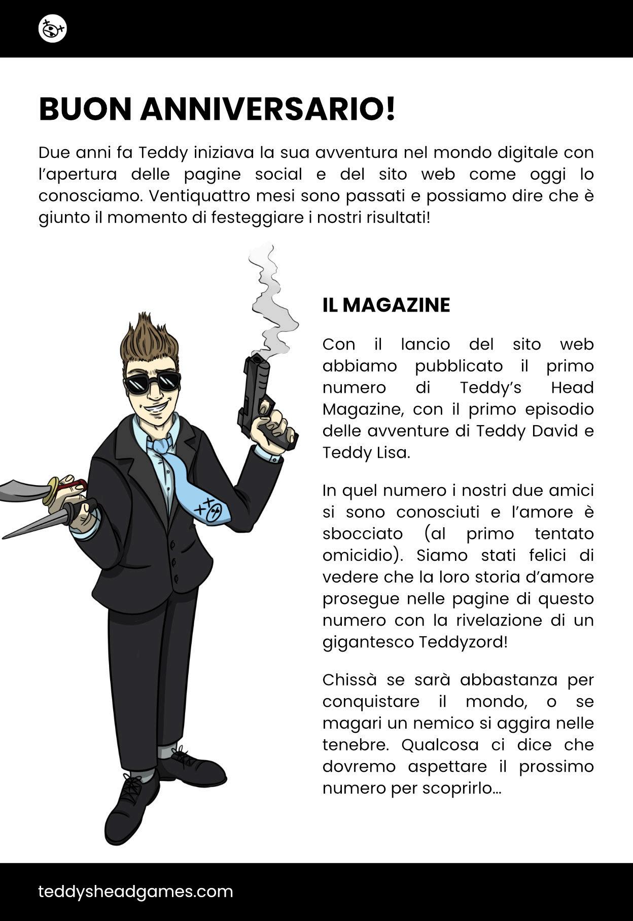 Teddy Magazine è la rivista in cui scoprirai tutte le novità riguardanti il mondo di Teddy's Head Games. All'interno troverai un meraviglioso fumetto, che racconta le avventure bizzarre e imprevedibili di Teddy Lisa e Teddy David. Tra queste pagine, inoltre, scoprirete alcuni dei giochi su cui stiamo lavorando e sarete aggiornati sui loro sviluppi.