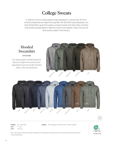 College Sweats A collection of luxury heavyweight sweats designed in a sporty look. All of our brushed sweatshirts are made from long fiber 310-320 GSM cotton/polyester. Our three-thread fabric gives the sweats a uniquely smooth and soft surface, and they have all been double-dyed to make the colours even brighter. These truly are the best quality sweats in the industry.