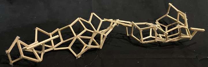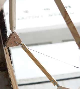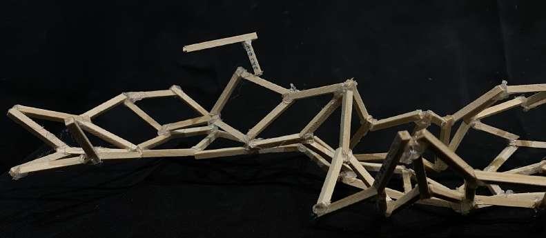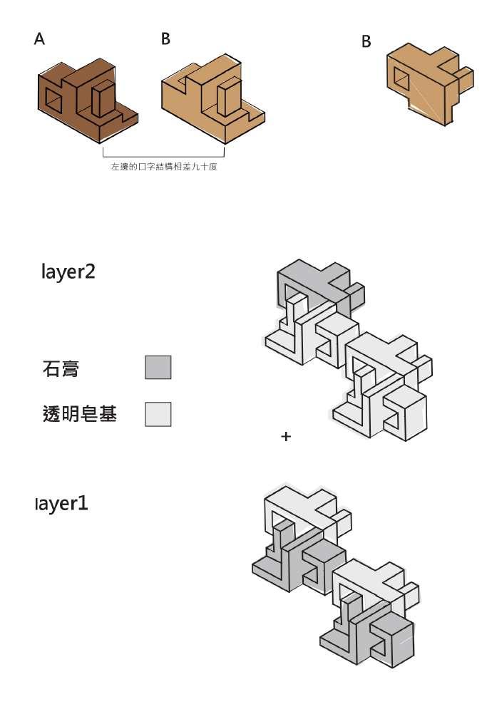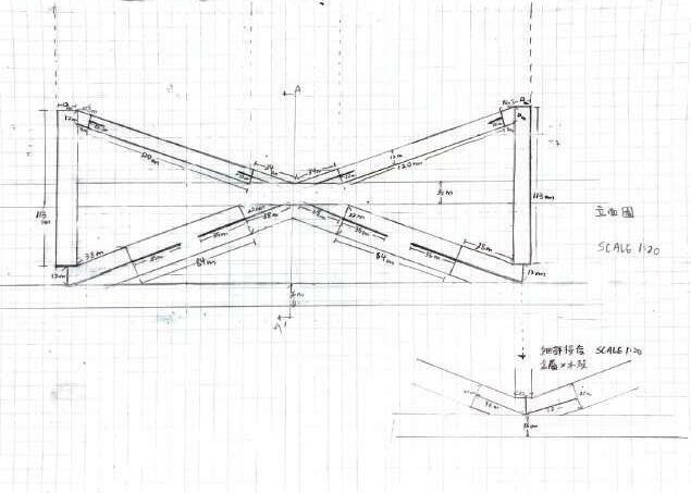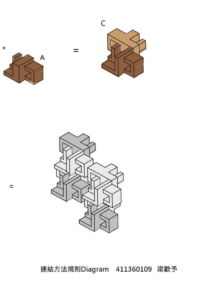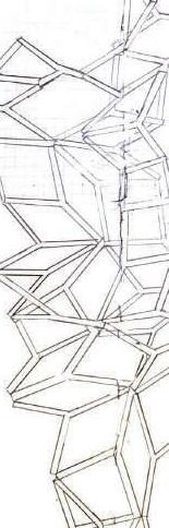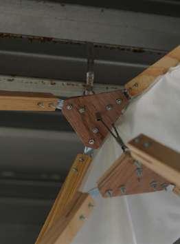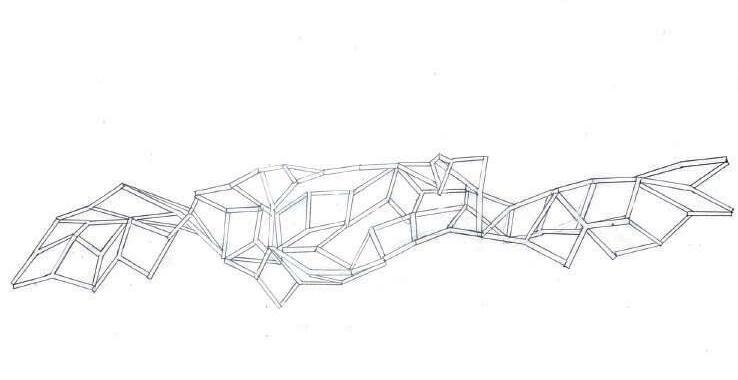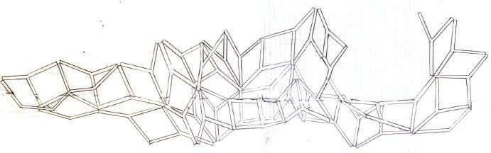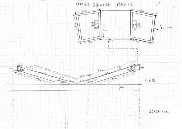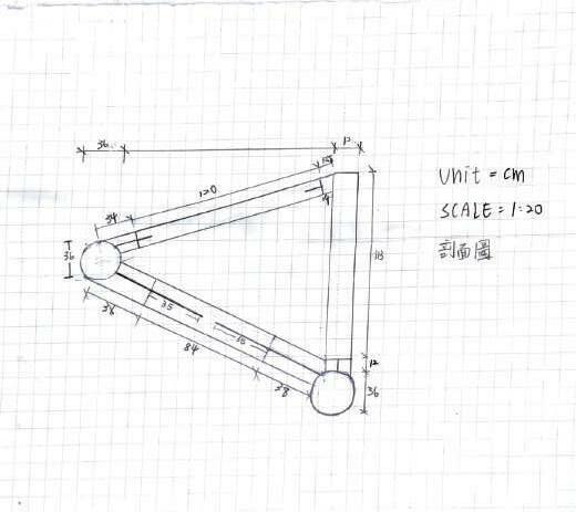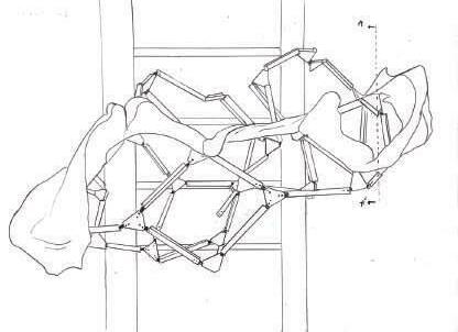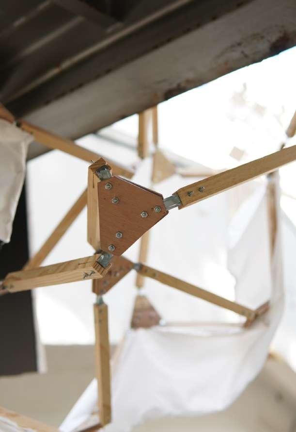 1.單元: 原本將所有單元固定水平垂直向度的角度,再統一用相同的關節相互連接,希望最後的姿態可以是很幾何的, 但後來發現因為角鐵太軟,會因為單元組合自身的重量改變型態,於是為了使結構穩固,在力量不足處加上單元, 並用鋼索串起兩層,再用套管固定兩層間的距離使其上下都有支撐力。