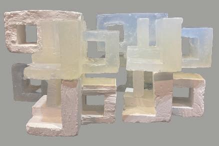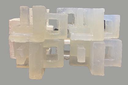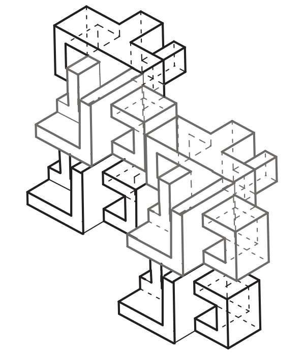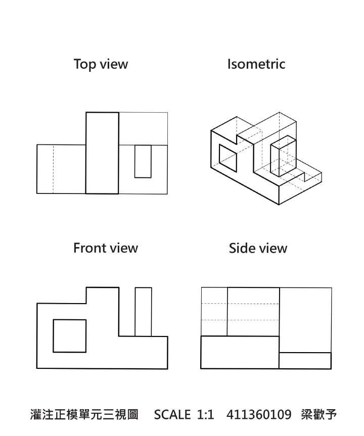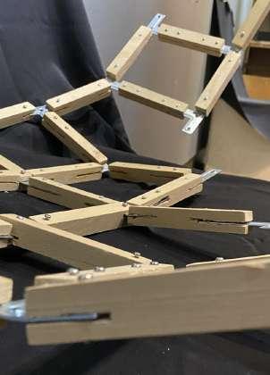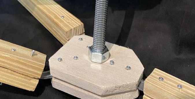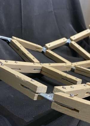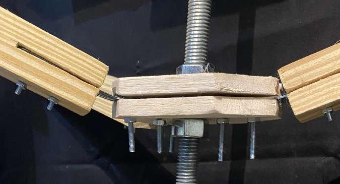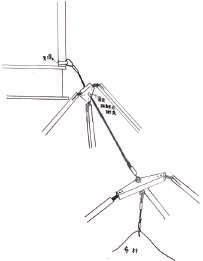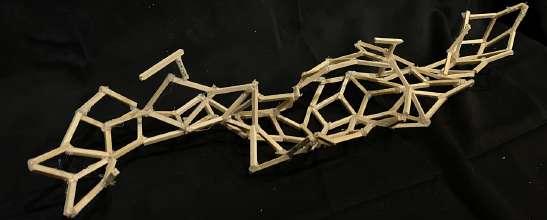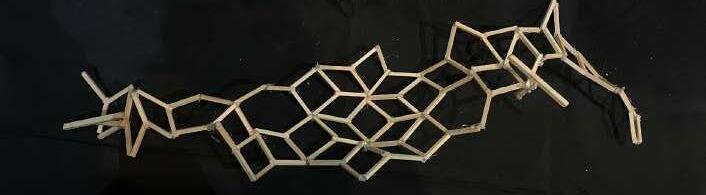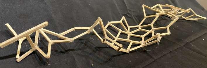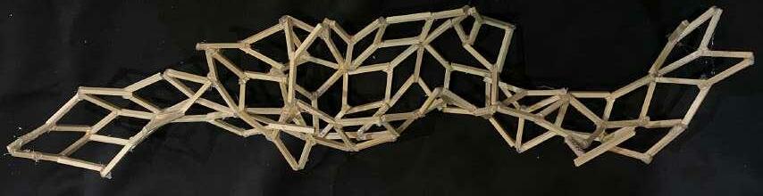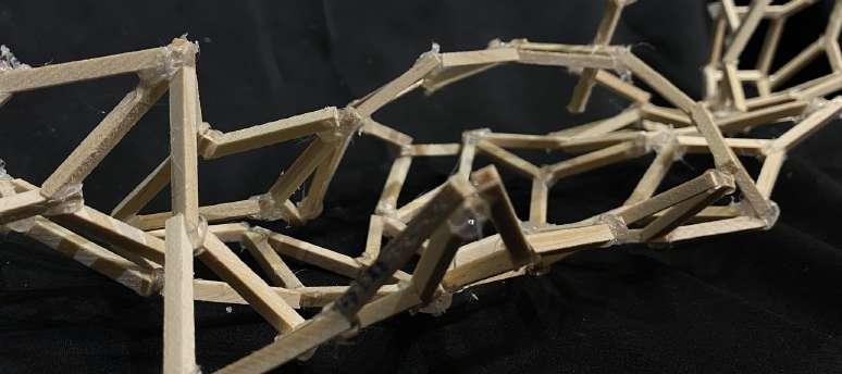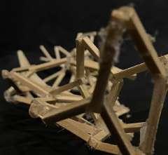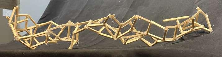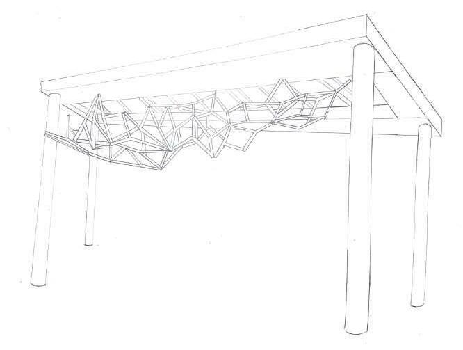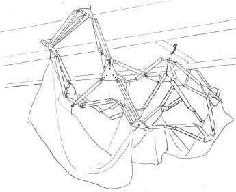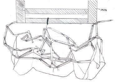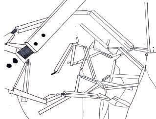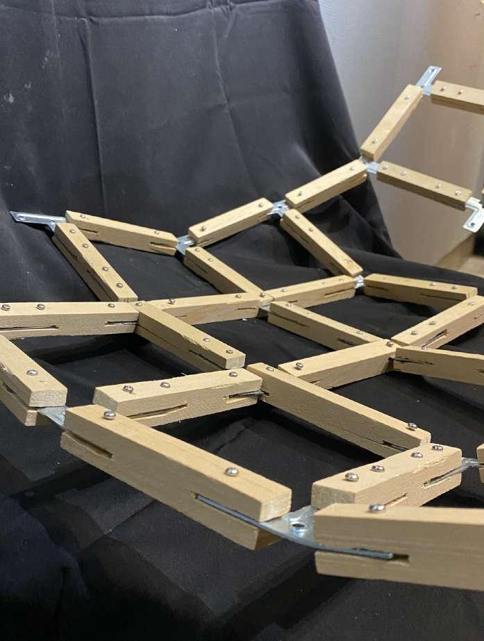 1.單元: 原本將所有單元固定水平垂直向度的角度,再統一用相同的關節相互連接,希望最後的姿態可以是很幾何的, 但後來發現因為角鐵太軟,會因為單元組合自身的重量改變型態,於是為了使結構穩固,在力量不足處加上單元, 並用鋼索串起兩層,再用套管固定兩層間的距離使其上下都有支撐力。