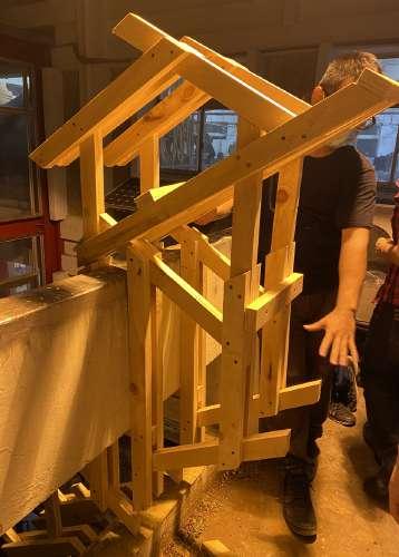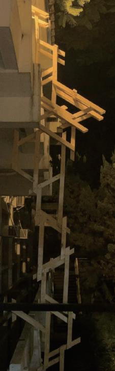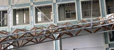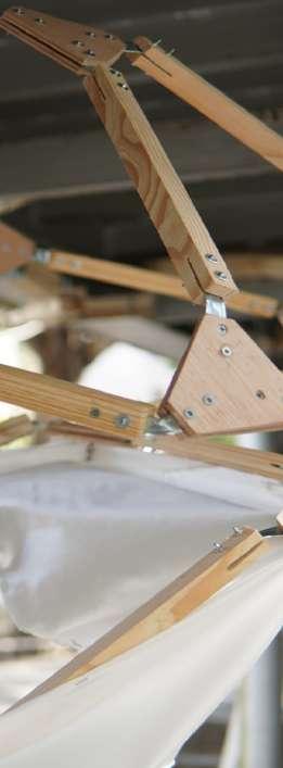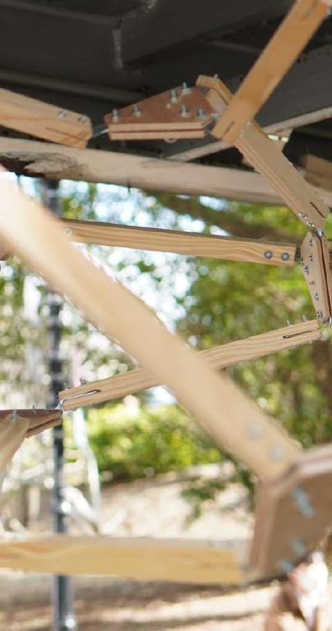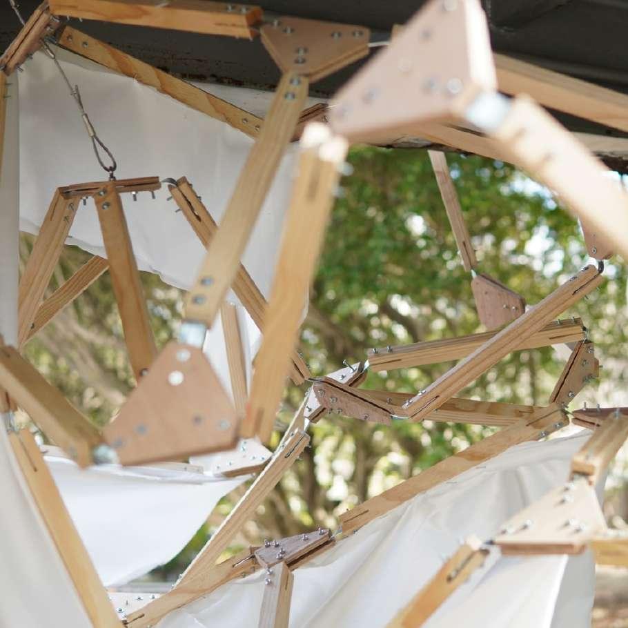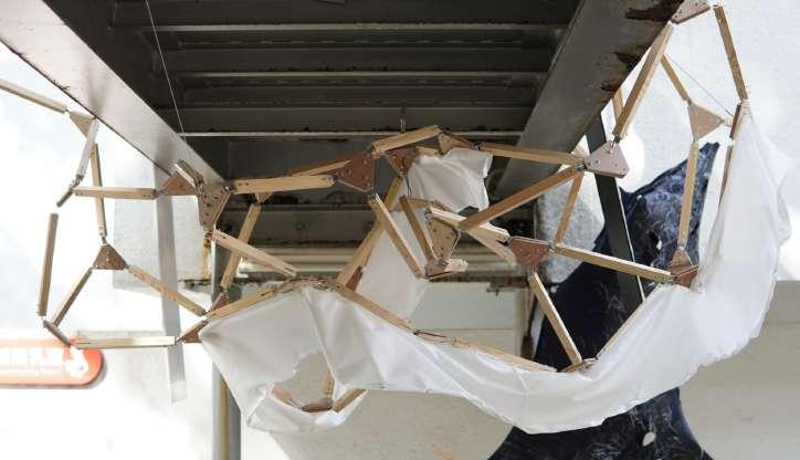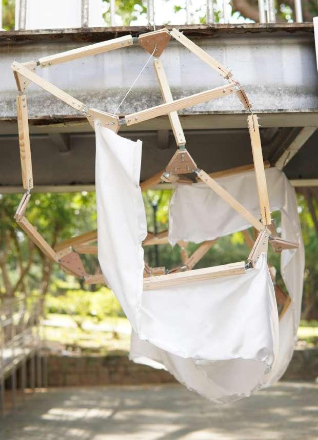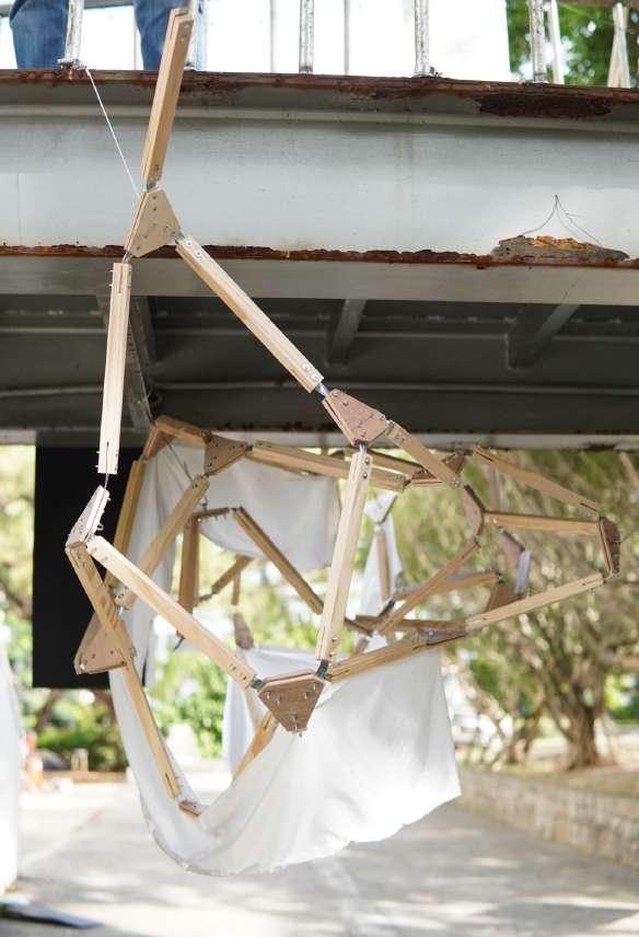 1.風: 冬季的東北季風會繞過海事博物館兩側經過鐵橋下,偶爾會有陣風從西南方吹過鐵橋下,所以在鐵橋下會有橫向的風 我在作品下方懸掛了白絲綢,希望可以回應基地的風向,並在風吹過時,除上層木結構的扭轉外下方還可以有一個柔性地扭動。
