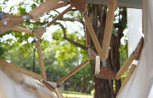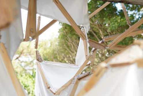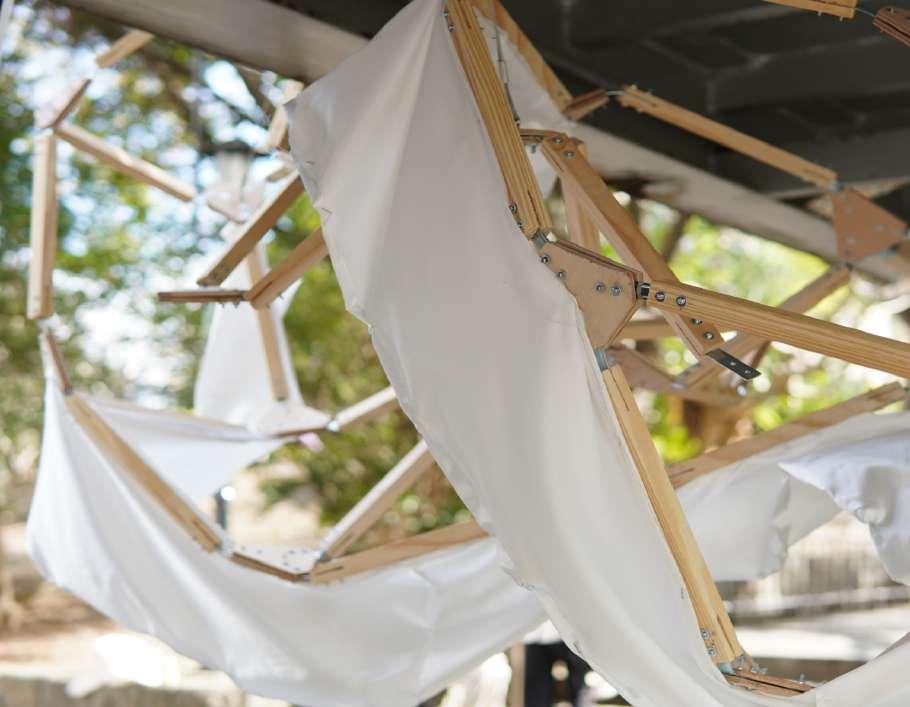 3.布料連接: 延續懸掛的語言,用繩索連接布料,使布料比較容易被風吹起,選擇白絲綢是因為白色的緞面可以反射陽光 或夜晚的光線,去回應基地的日照或照明。