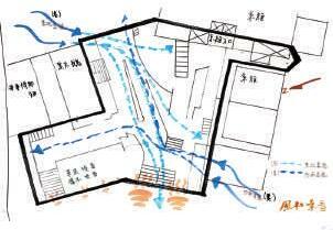 2.人流:海事博物館前非主要動線所以相對安靜,鐵橋前有一個蜿蜒的路徑,旁邊有階梯,上方是天橋,鐵橋下匯聚了所有 路徑的開口,作品的蜿蜒姿態是延續後方的開口和呼應風向,從鐵橋右後方繼續朝左前方蜿蜒。