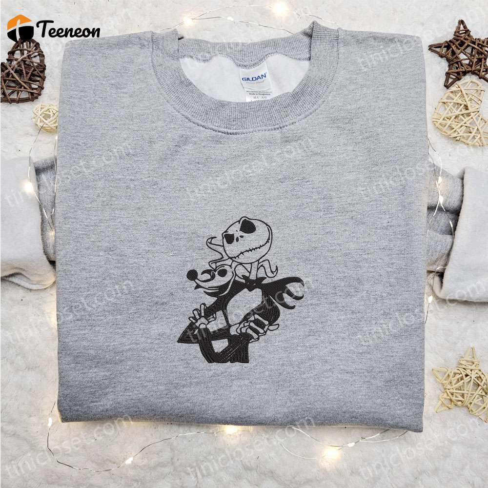 Introducing our Jack Skellington And Zero Embroidered Sweatshirt, the perfect addition to your Halloween wardrobe. This sweatshirt