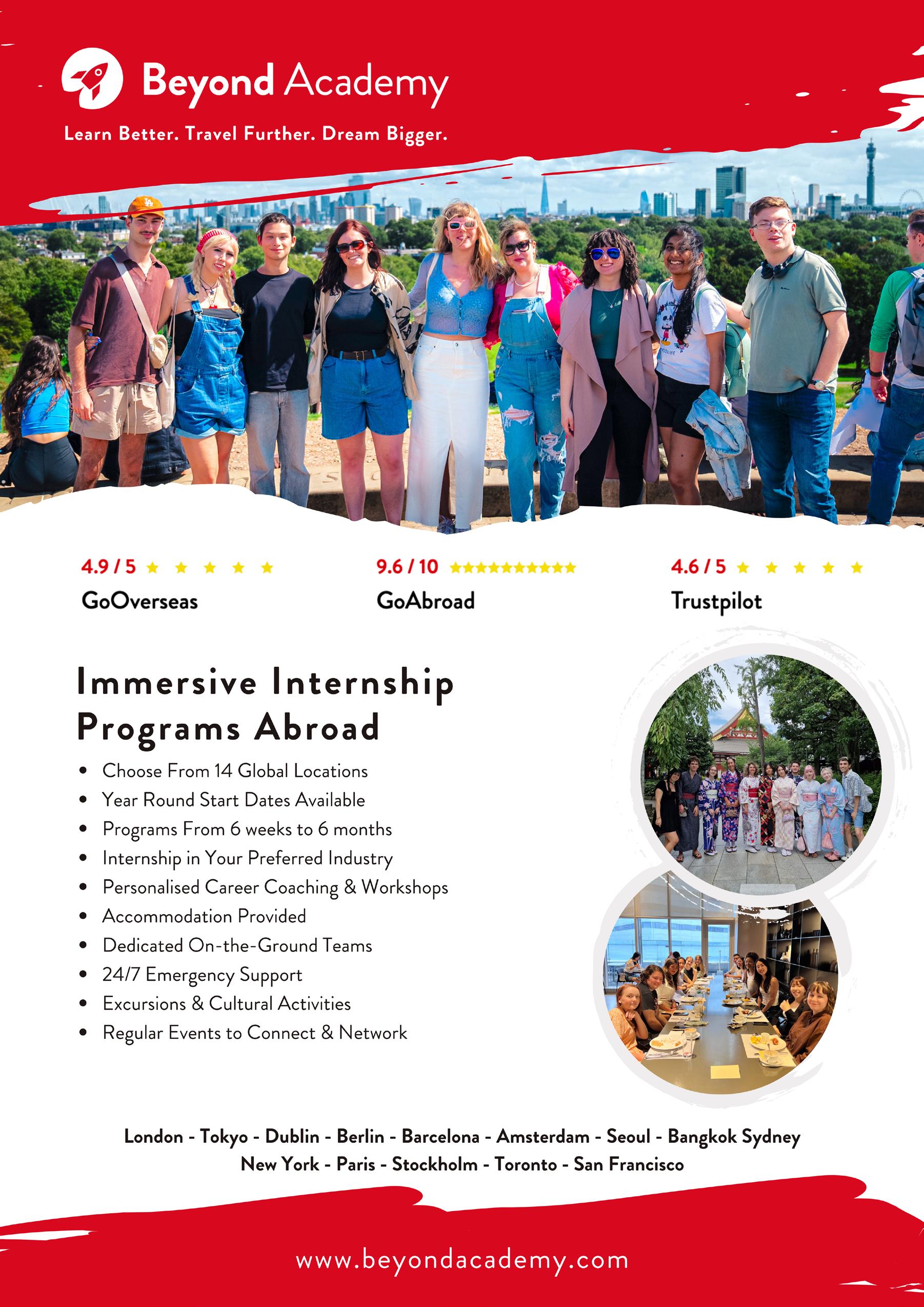 Interning abroad with Beyond Academy is a life-changing journey. Students gain hands-on experience through a customized internship, tailored career support, and opportunities to build a global network. With a strong focus on cultural immersion, our programs blend professional growth with exploring local traditions, cuisine, and activities. The result? Return home as a truly global citizen, ready to make an impact. Programs are available in 14 Global locations with start dates every month and durations from 6 weeks to 6 months.