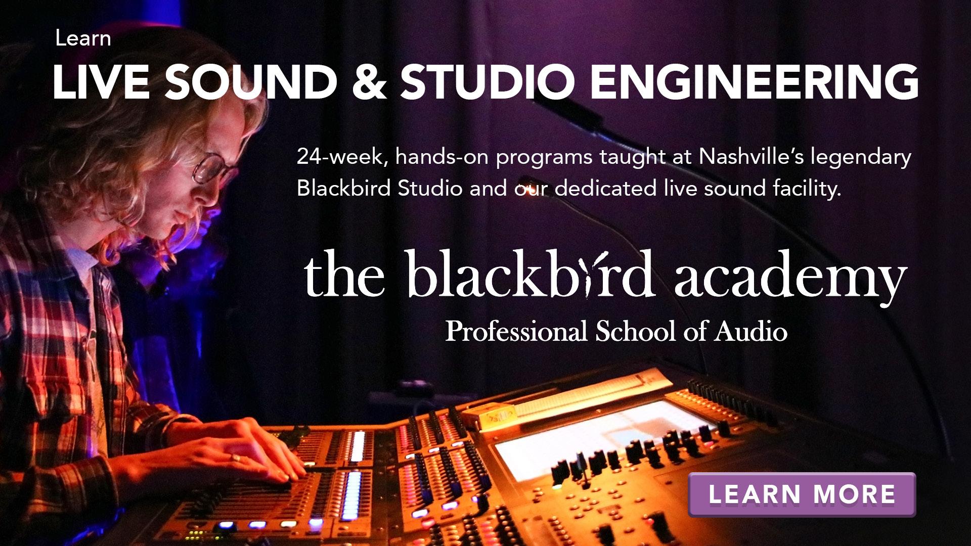 The Blackbird Academy— Professional School of Audio is consistently ranked in the top 5 audio/engineering schools in the nation. We have a world-renowned reputation for our outstanding graduates in our Live Sound and Studio Engineering Programs. We emphasize a mentor-based, hands-on education. With over 700+ hours of hands-on training, our students graduate with not only the technical skills needed to work in audio but also the art of production from the industry's top creative names. Learn More »