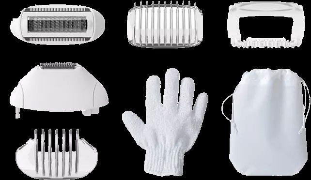 ефикасен систем за отстранување на влакна, епилациона глава што се мие дополнителни додатоци, глава за бричење, додаток со чешел за потстрижување, тример за бикини, ракавица за пилинг торбичка, четка за чистење