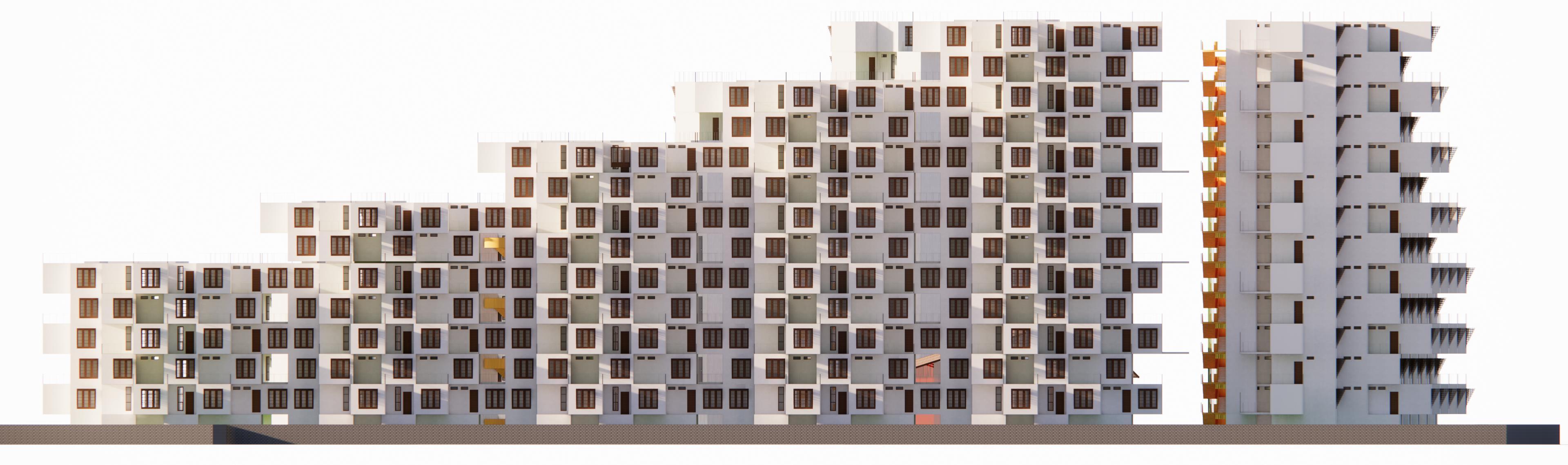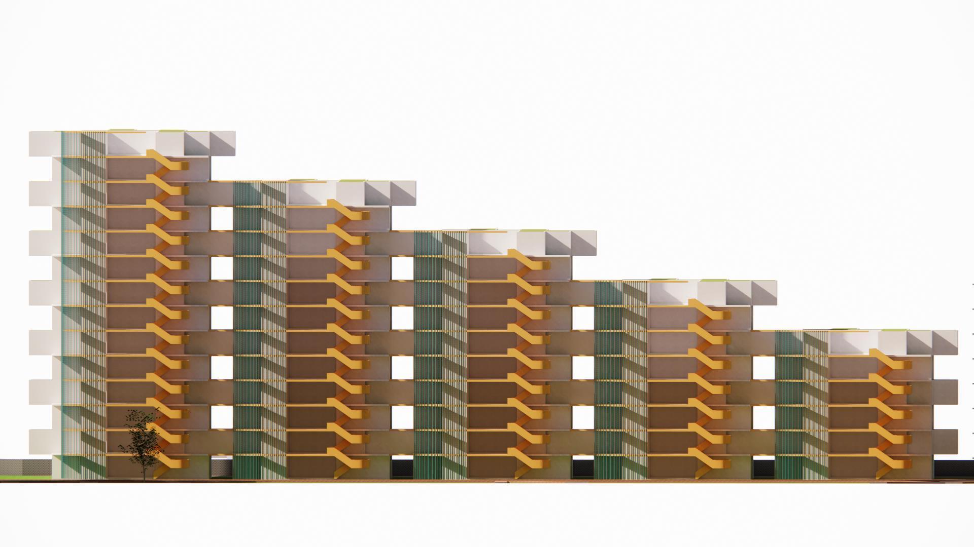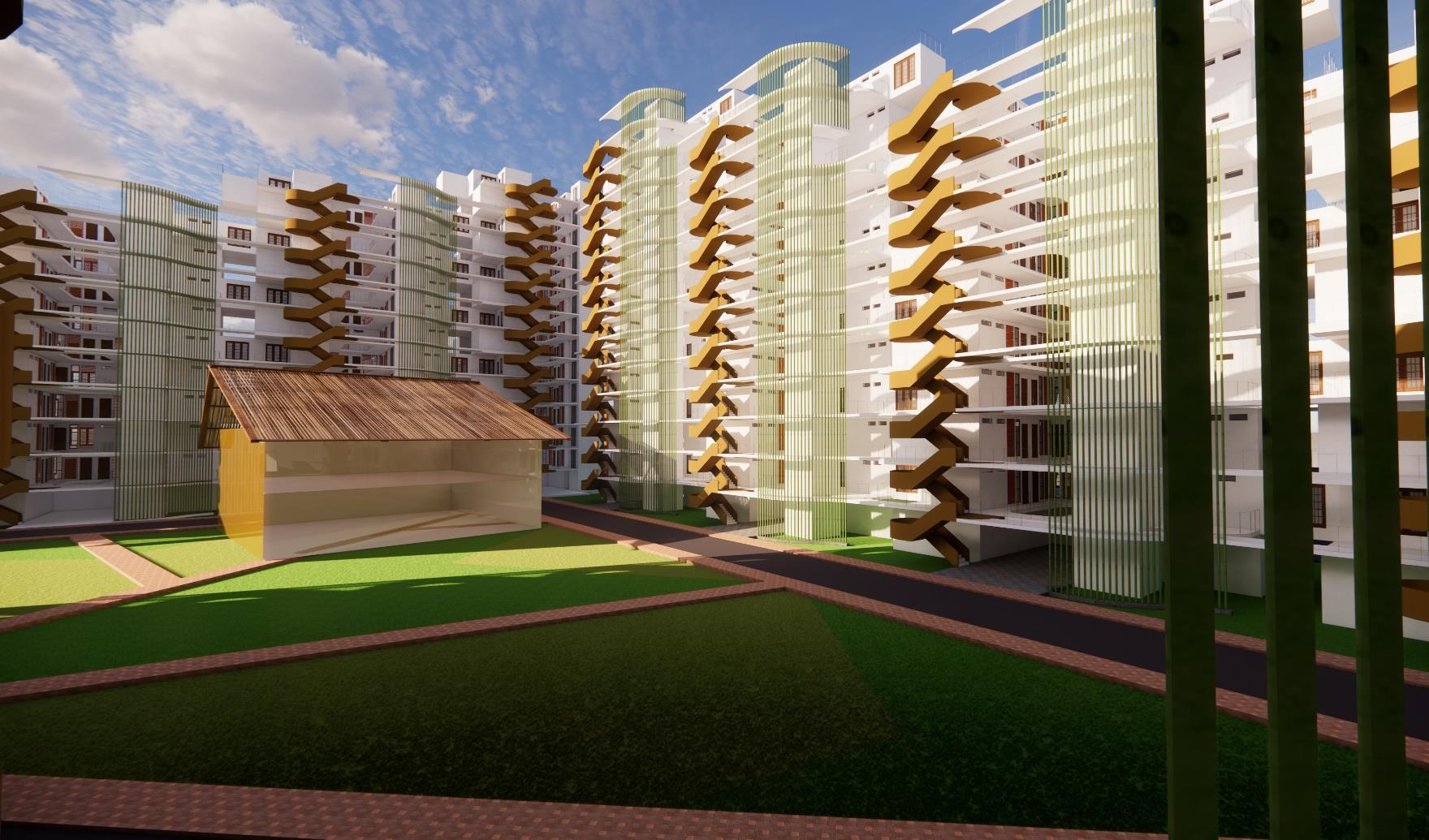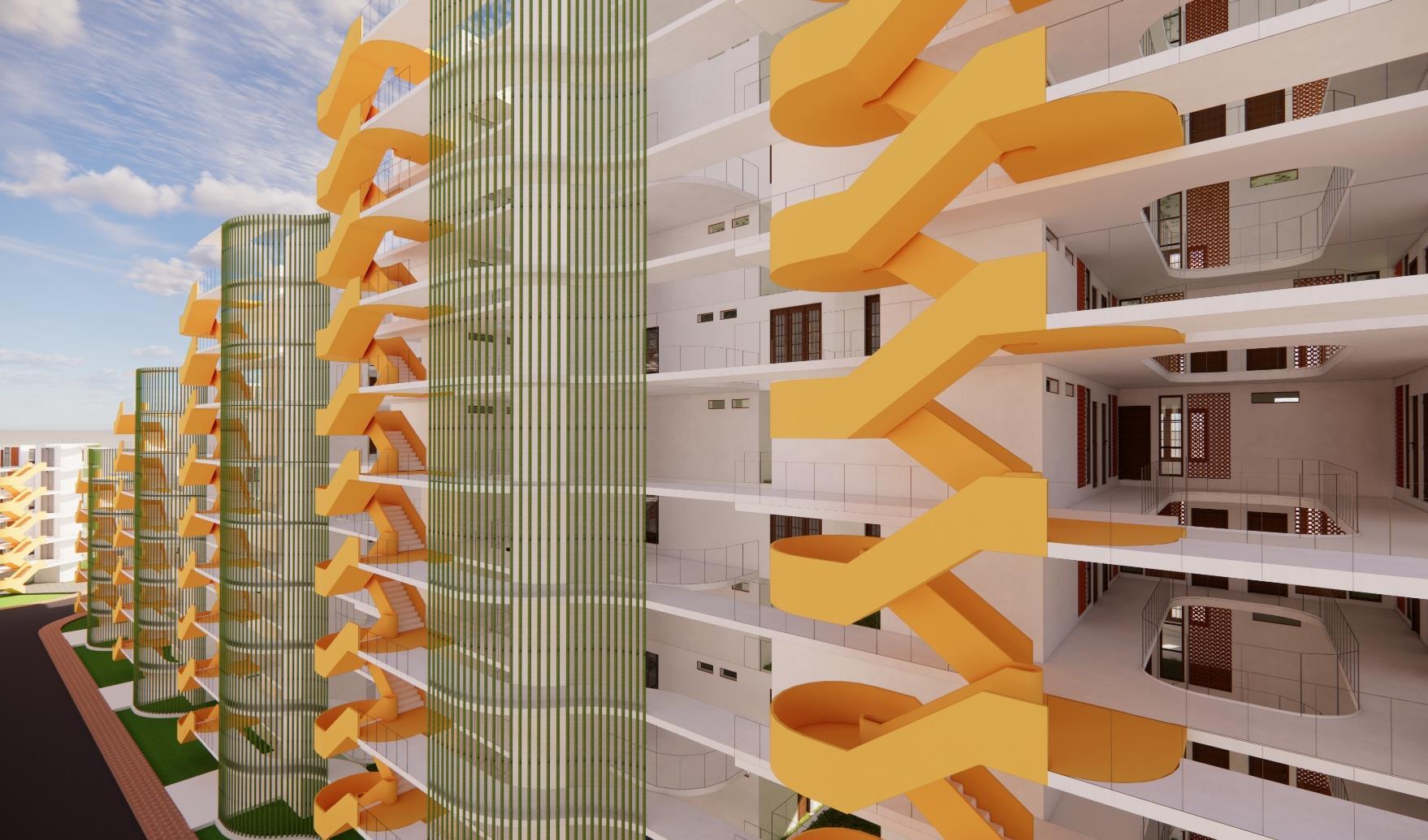 FURTHER ENHANCING THE BUILDING'S MATERIAL PALETTE AND ENVIRONMENTAL CONSIDERATIONS, BAMBOO LOUVERSARE THOUGHTFULLY INTEGRATED ALONG THE LIFTAND CORRIDOR AREAS, EXTENDING VERTICALLYACROSS THE ENTIRE HEIGHT OF THE BUILDINGS. THESE LOUVERS NOT ONLYADDANATURAL, SUSTAINABLE, AND VISUALLYAPPEALING ELEMENT TO THE FACADE BUTALSO PROVIDE SHADINGAND PRIVACY. COMPLEMENTING THESE FEATURES, JAALI WITH CREEPERSARE INCORPORATED INTO THE DESIGN, INTRODUCING VIBRANT GREENERYAND NATURALTEXTURE TO THE BUILDING'S EXTERIOR. THIS BIOPHILIC INTEGRATION SOFTENS THEARCHITECTURAL LINES AND CONTRIBUTES TOAHEALTHIER URBAN ENVIRONMENT. FROM THE INNER ELEVATION VIEWS, THE EXPOSED STAIRCASESARE VISIBLE, ADDINGANOTHER LAYER OF DEPTHAND VISUAL INTEREST WHILE HIGHLIGHTING THEIR FUNCTIONAL ROLEAS VERTICAL CIRCULATION ELEMENTS