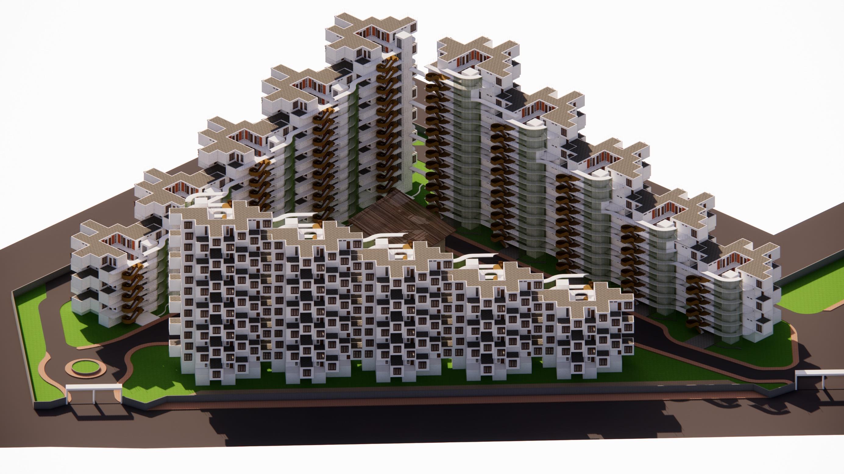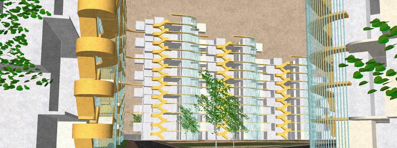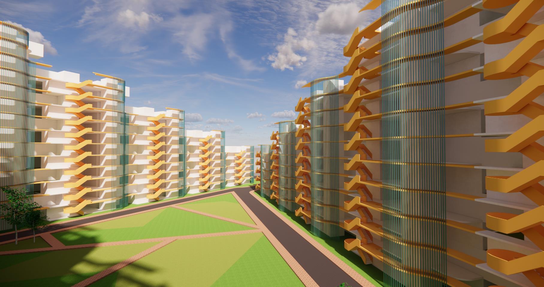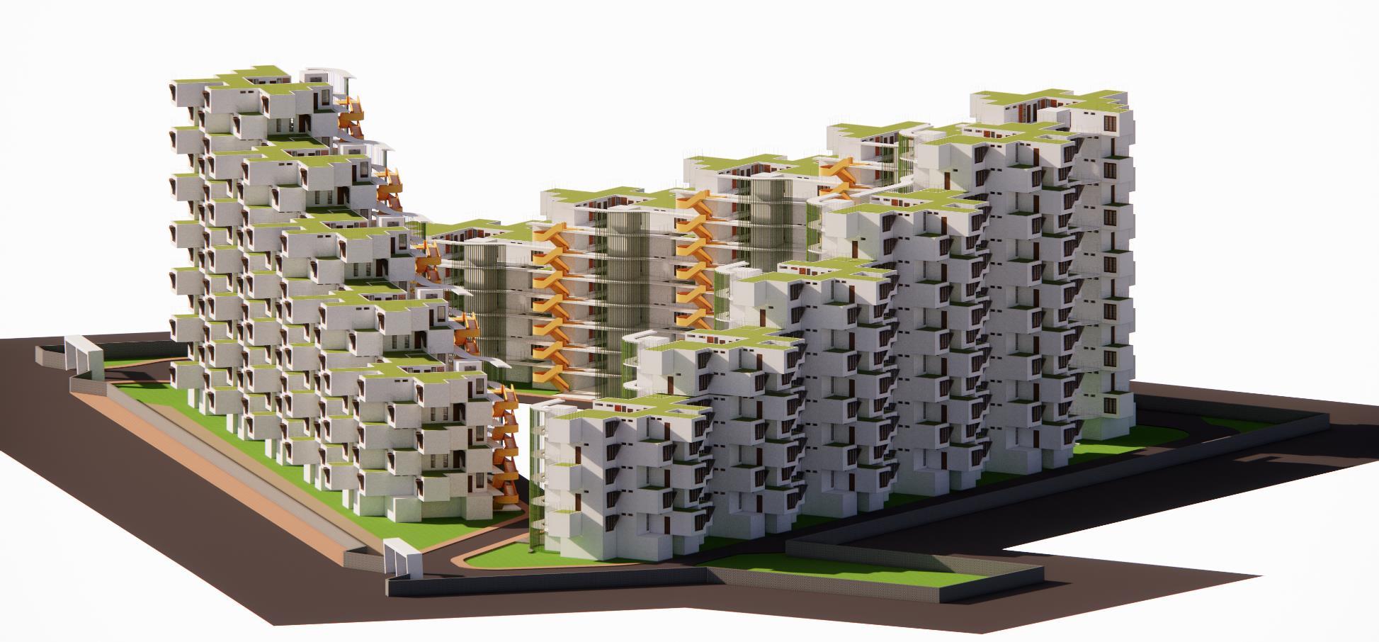FURTHER ENHANCING THE BUILDING'S MATERIAL PALETTE AND ENVIRONMENTAL CONSIDERATIONS, BAMBOO LOUVERSARE THOUGHTFULLY INTEGRATED ALONG THE LIFTAND CORRIDOR AREAS, EXTENDING VERTICALLYACROSS THE ENTIRE HEIGHT OF THE BUILDINGS. THESE LOUVERS NOT ONLYADDANATURAL, SUSTAINABLE, AND VISUALLYAPPEALING ELEMENT TO THE FACADE BUTALSO PROVIDE SHADINGAND PRIVACY. COMPLEMENTING THESE FEATURES, JAALI WITH CREEPERSARE INCORPORATED INTO THE DESIGN, INTRODUCING VIBRANT GREENERYAND NATURALTEXTURE TO THE BUILDING'S EXTERIOR. THIS BIOPHILIC INTEGRATION SOFTENS THEARCHITECTURAL LINES AND CONTRIBUTES TOAHEALTHIER URBAN ENVIRONMENT. FROM THE INNER ELEVATION VIEWS, THE EXPOSED STAIRCASESARE VISIBLE, ADDINGANOTHER LAYER OF DEPTHAND VISUAL INTEREST WHILE HIGHLIGHTING THEIR FUNCTIONAL ROLEAS VERTICAL CIRCULATION ELEMENTS