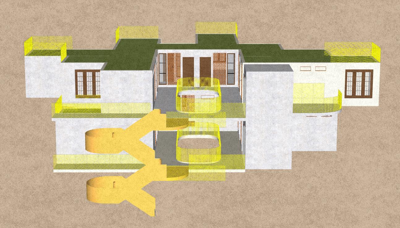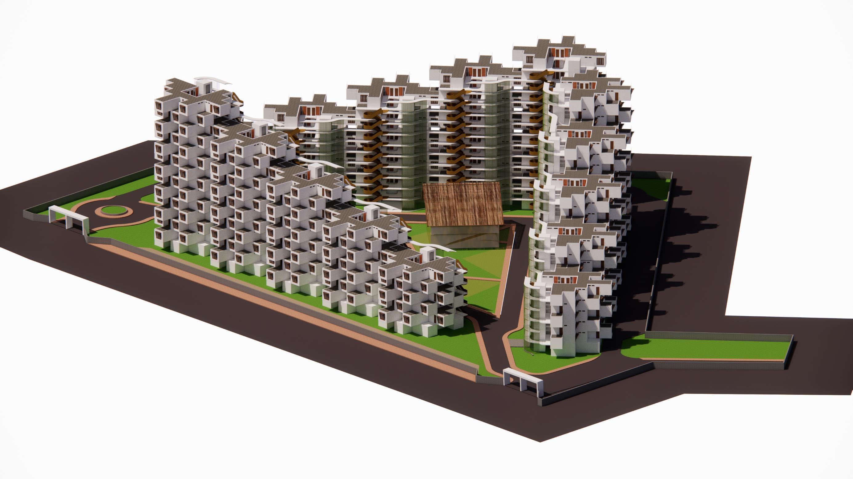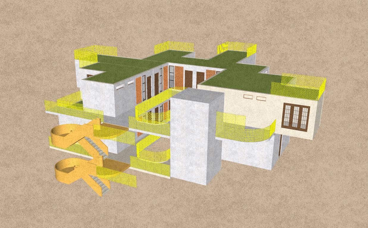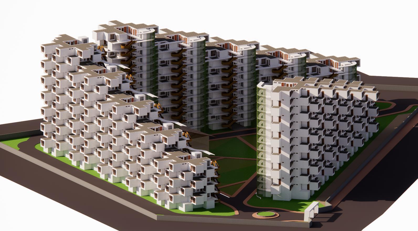 FURTHER ENHANCING THE BUILDING'S MATERIAL PALETTE AND ENVIRONMENTAL CONSIDERATIONS, BAMBOO LOUVERSARE THOUGHTFULLY INTEGRATED ALONG THE LIFTAND CORRIDOR AREAS, EXTENDING VERTICALLYACROSS THE ENTIRE HEIGHT OF THE BUILDINGS. THESE LOUVERS NOT ONLYADDANATURAL, SUSTAINABLE, AND VISUALLYAPPEALING ELEMENT TO THE FACADE BUTALSO PROVIDE SHADINGAND PRIVACY. COMPLEMENTING THESE FEATURES, JAALI WITH CREEPERSARE INCORPORATED INTO THE DESIGN, INTRODUCING VIBRANT GREENERYAND NATURALTEXTURE TO THE BUILDING'S EXTERIOR. THIS BIOPHILIC INTEGRATION SOFTENS THEARCHITECTURAL LINES AND CONTRIBUTES TOAHEALTHIER URBAN ENVIRONMENT. FROM THE INNER ELEVATION VIEWS, THE EXPOSED STAIRCASESARE VISIBLE, ADDINGANOTHER LAYER OF DEPTHAND VISUAL INTEREST WHILE HIGHLIGHTING THEIR FUNCTIONAL ROLEAS VERTICAL CIRCULATION ELEMENTS