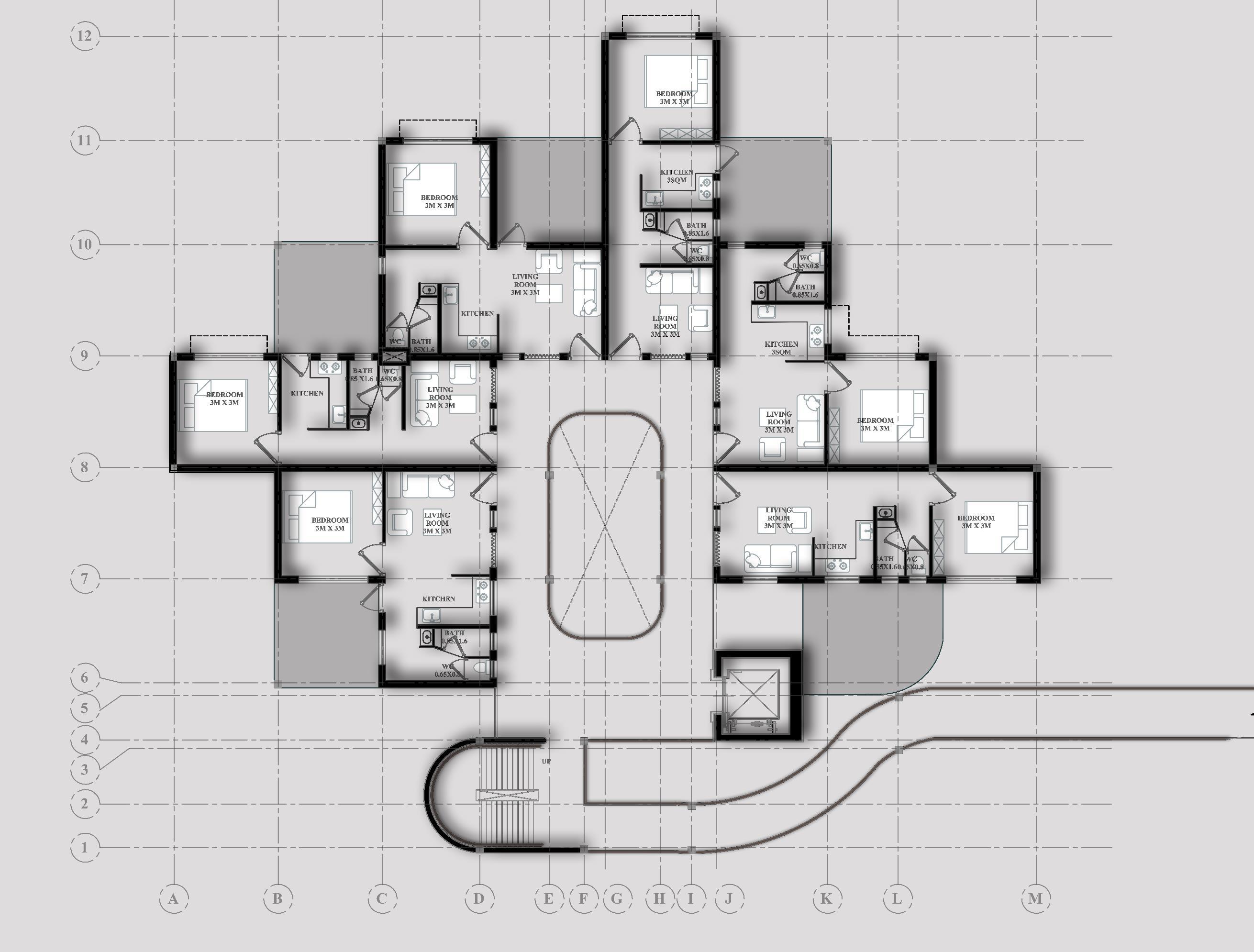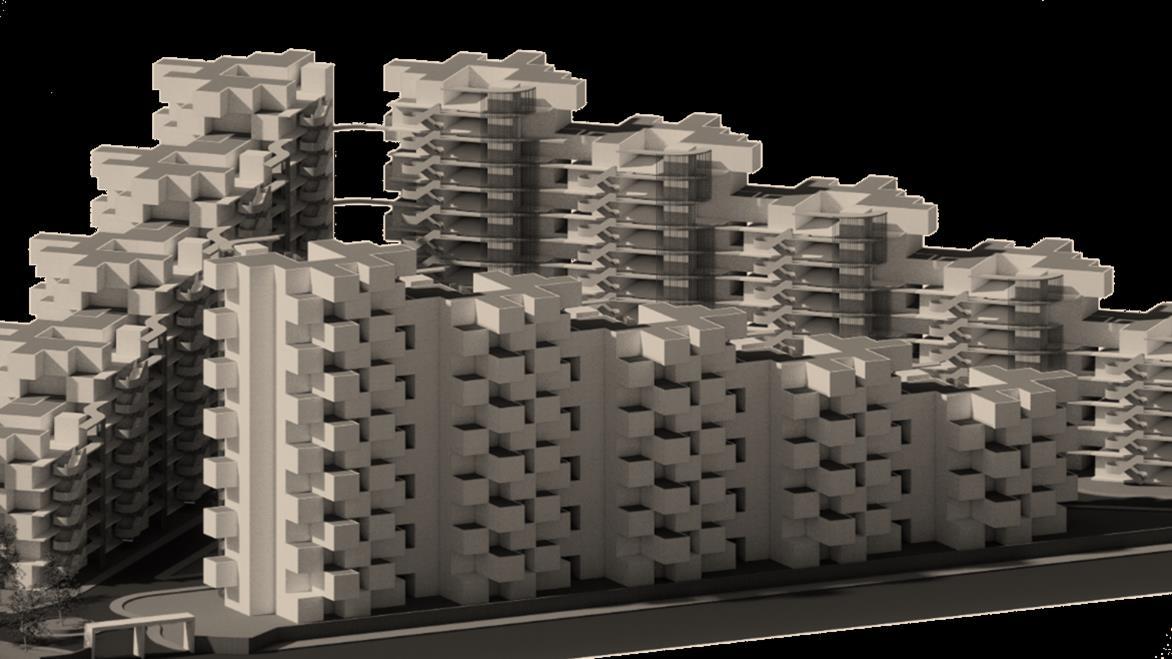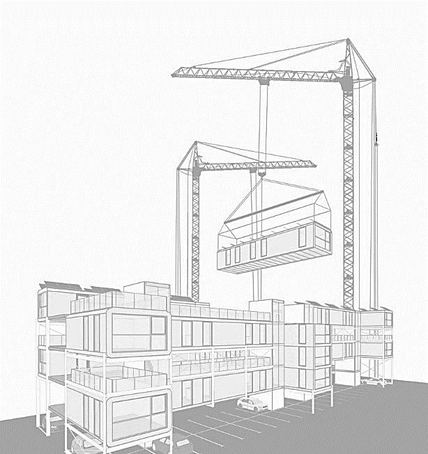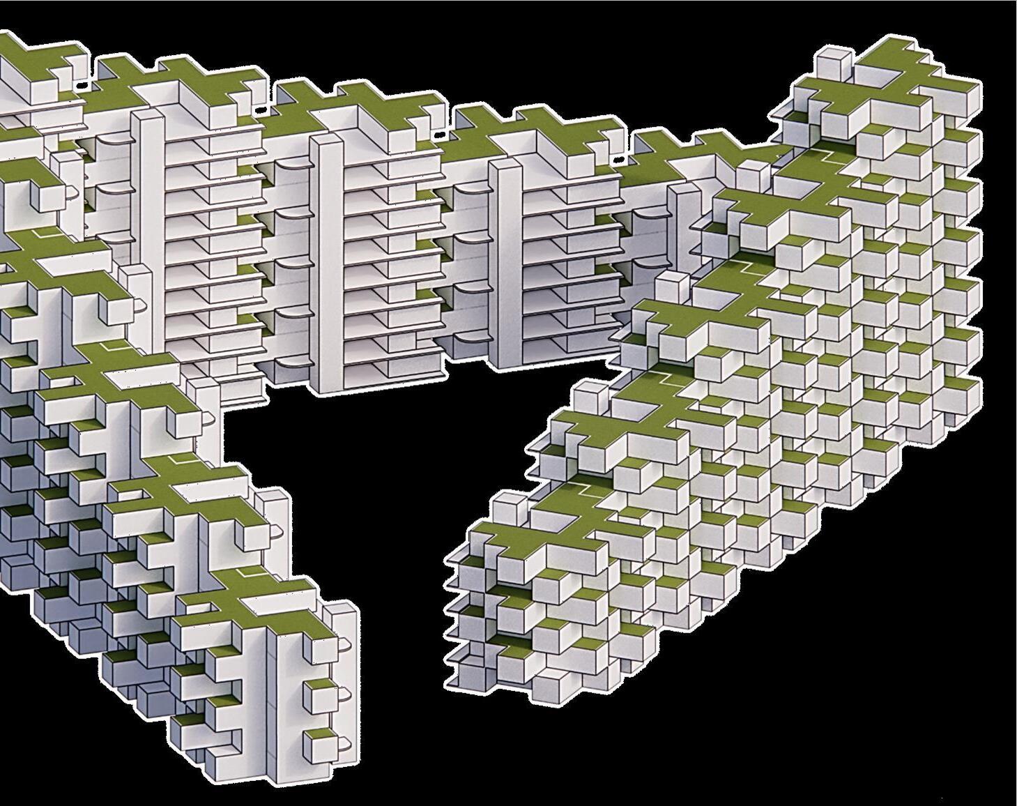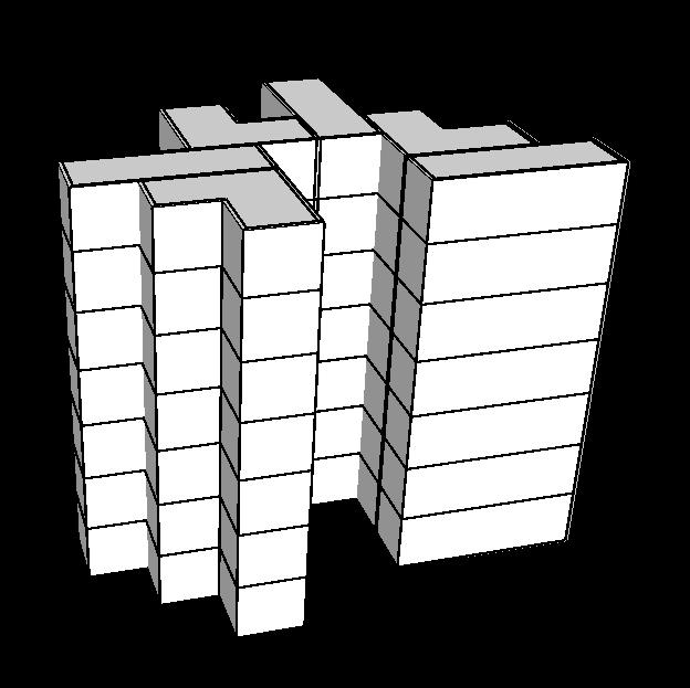 DESIGN FEATURES TWO DISTINCT FLOOR PLAN MODULES, CREATING DYNAMIC AND VARIED LIVING SPACES. THE GROUND FLOOR MODULE CONTAINS FIVE UNITS, WHILE THE FIRST-FLOOR MODULE HAS SIX,ALTERNATING VERTICALLYTHROUGHOUT THE BUILDING. THIS REPETITION ESTABLISHESARHYTHMIC AESTHETIC, WITH VARYING UNIT COUNTSADDING COMPLEXITY. EACH UNIT INCLUDESAMULTIFUNCTIONAL SPACE,AND ALL UNITS WITHIN AMODULE CONNECT TOACENTRAL LOBBY, WHICH THEN LINKS TOALL OTHER LOBBIES, FOSTERING COMMUNITY. THIS DESIGN FUNCTIONSAS BOTH ROWAND GROUP HOUSING.